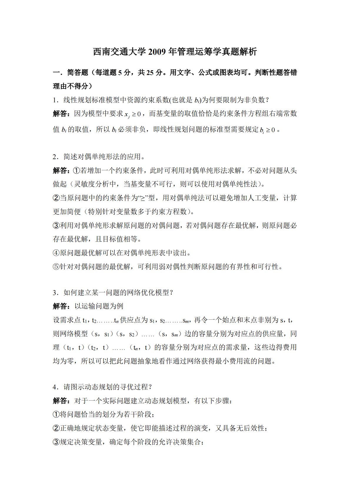 西南交通大学2009年管理运筹学真题解析一.简答题(每道题5分,共25分。用文字、公式或图表均可。判断性题答错理由不得分)1.线性规划标准模型中资源约束系数(也就是bi)为何要限制为非负数?解答:因为模型中要求0jx≥,而基变量的取值恰恰是约束条件方程组右端常数值bi的取值,所以bi必须非负,即线性规划问题的标准型需要规定0ib≥。2.简述对偶单纯形法的应用。解答:①若增加一个约束条件,此时可利用对偶单纯形法求解,不必对问题从头做起(灵敏度分析中,当基变量不可行,则可以使用对偶单纯性法)。②当原问题中的约束条件为“≥”型,用对偶单纯法可以避免增加人工变量,计算更加简便(特别针对变量数多于约束方...