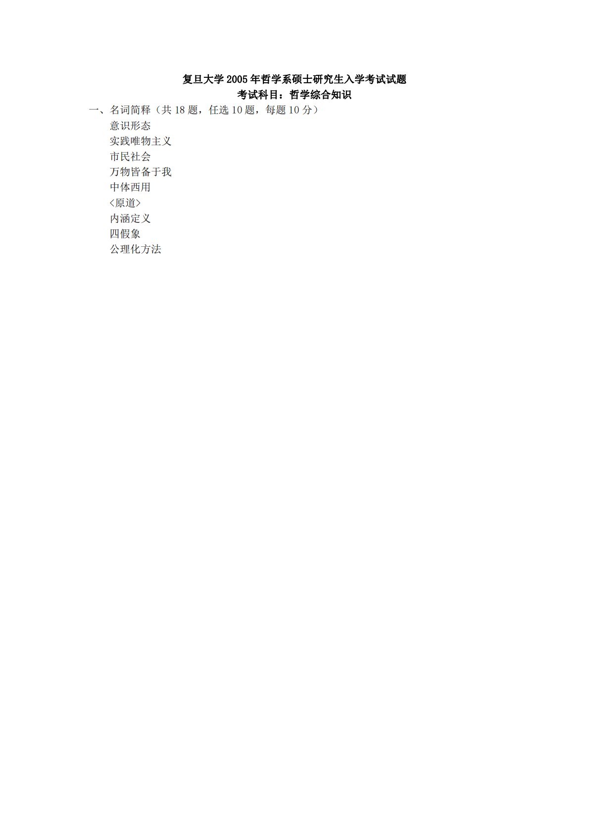 复旦大学716哲学综合知识2005年真题回忆版