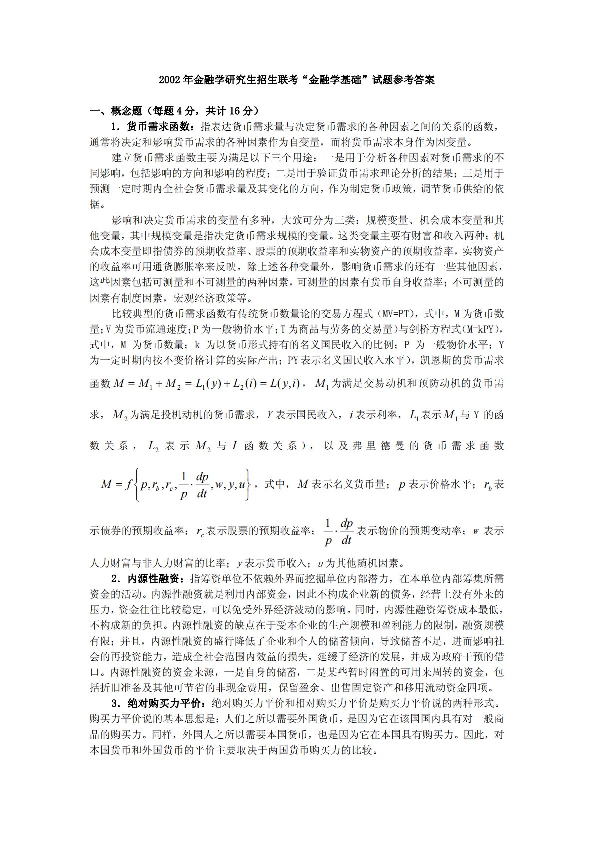 2002年金融学研究生招生联考“金融学基础”试题参考答案一、概念题(每题4分,共计16分)1.货币需求函数:指表达货币需求量与决定货币需求的各种因素之间的关系的函数,通常将决定和影响货币需求的各种因素作为自变量,而将货币需求本身作为因变量。建立货币需求函数主要为满足以下三个用途:一是用于分析各种因素对货币需求的不同影响,包括影响的方向和影响的程度;二是用于验证货币需求理论分析的结果;三是用于预测一定时期内全社会货币需求量及其变化的方向,作为制定货币政策,调节货币供给的依据。影响和决定货币需求的变量有多种,大致可分为三类:规模变量、机会成本变量和其他变量,其中规模变量是指决定货币需求规模的变量。...
