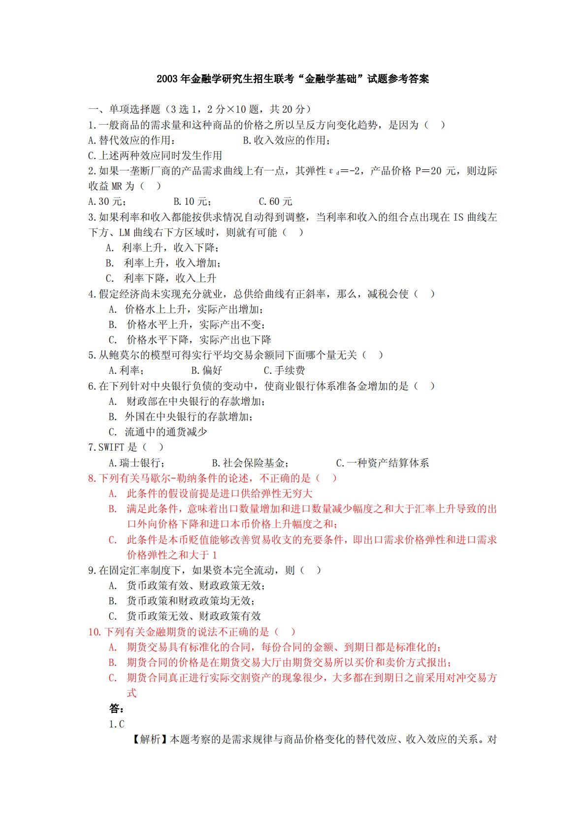 2003年金融学研究生招生联考“金融学基础”试题参考答案一、单项选择题(3选1,2分×10题,共20分)1.一般商品的需求量和这种商品的价格之所以呈反方向变化趋势,是因为()A.替代效应的作用:B.收入效应的作用;C.上述两种效应同时发生作用2.如果一垄断厂商的产品需求曲线上有一点,其弹性εd=-2,产品价格P=20元,则边际收益MR为()A.30元;B.10元;C.60元3.如果利率和收入都能按供求情况自动得到调整,当利率和收入的组合点出现在IS曲线左下方、LM曲线右下方区域时,则就有可能()A.利率上升,收入下降;B.利率上升,收入增加;C.利率下降,收入上升4.假定经济尚未实现充分就业,...