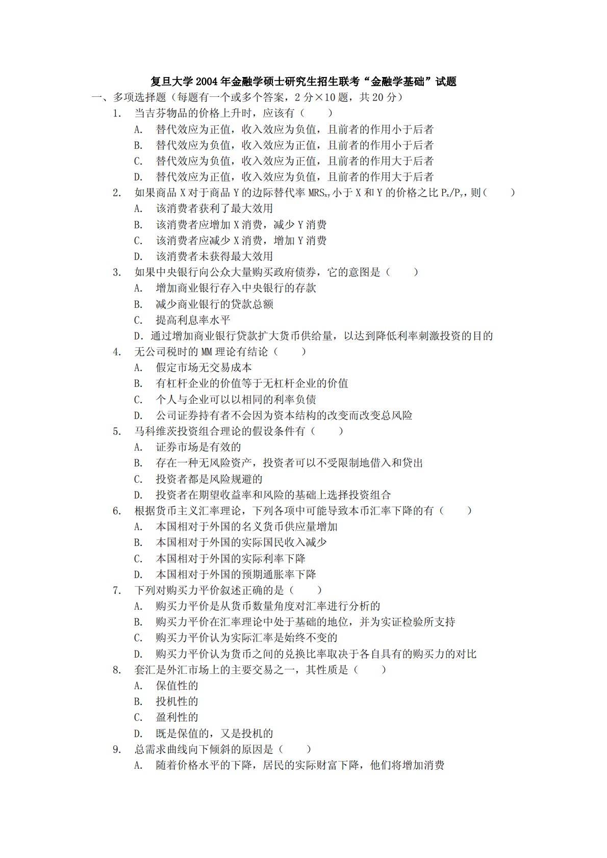 复旦大学2004年金融学硕士研究生招生联考“金融学基础”试题一、多项选择题(每题有一个或多个答案,2分×10题,共20分)1.当吉芬物品的价格上升时,应该有()A.替代效应为正值,收入效应为负值,且前者的作用小于后者B.替代效应为负值,收入效应为正值,且前者的作用小于后者C.替代效应为负值,收入效应为正值,且前者的作用大于后者D.替代效应为正值,收入效应为负值,且前者的作用大于后者2.如果商品X对于商品Y的边际替代率MRSxy小于X和Y的价格之比Px/Py,则()A.该消费者获利了最大效用B.该消费者应增加X消费,减少Y消费C.该消费者应减少X消费,增加Y消费D.该消费者未获得最大效用3.如果...