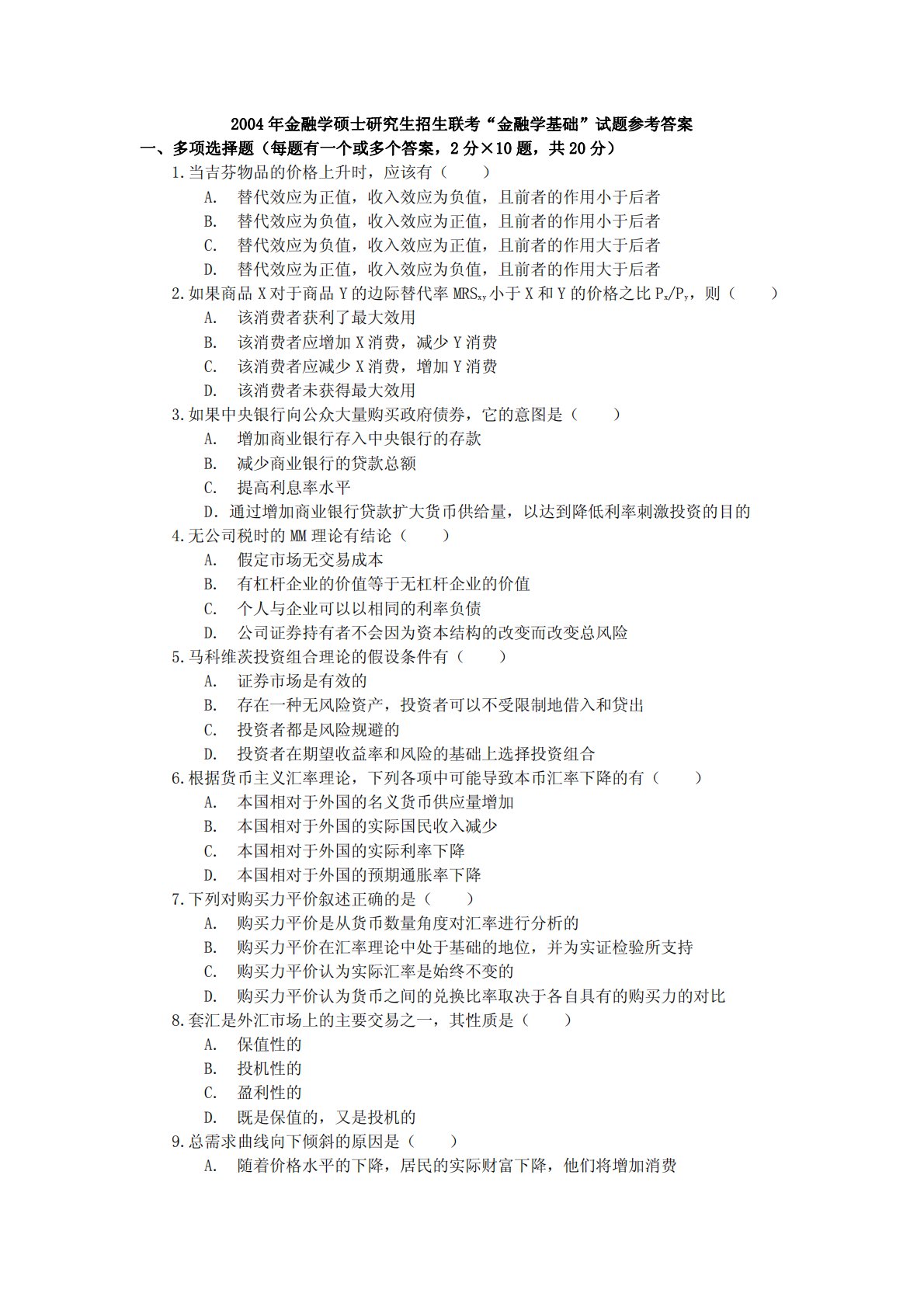 2004年金融学硕士研究生招生联考“金融学基础”试题参考答案一、多项选择题(每题有一个或多个答案,2分×10题,共20分)1.当吉芬物品的价格上升时,应该有()A.替代效应为正值,收入效应为负值,且前者的作用小于后者B.替代效应为负值,收入效应为正值,且前者的作用小于后者C.替代效应为负值,收入效应为正值,且前者的作用大于后者D.替代效应为正值,收入效应为负值,且前者的作用大于后者2.如果商品X对于商品Y的边际替代率MRSxy小于X和Y的价格之比Px/Py,则()A.该消费者获利了最大效用B.该消费者应增加X消费,减少Y消费C.该消费者应减少X消费,增加Y消费D.该消费者未获得最大效用3.如果...