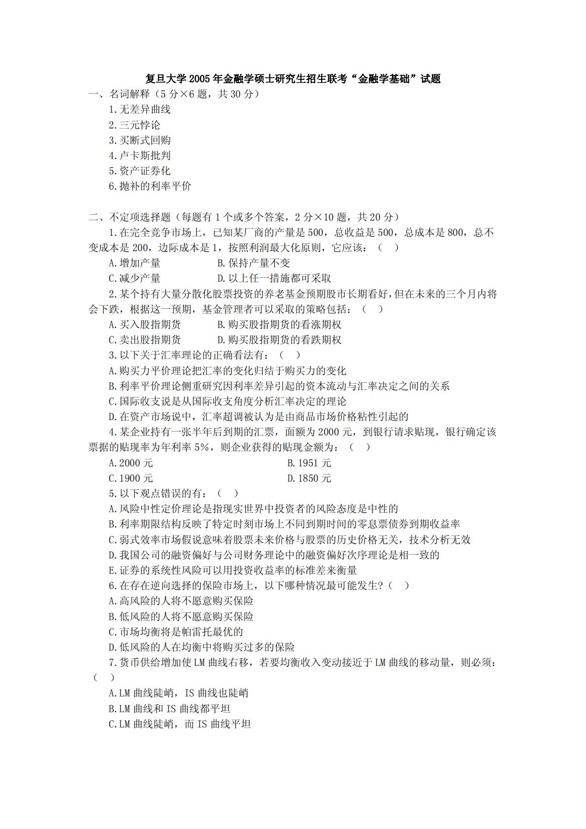 复旦大学2005年金融学硕士研究生招生联考“金融学基础”试题一、名词解释(5分×6题,共30分)1.无差异曲线2.三元悖论3.买断式回购4.卢卡斯批判5.资产证券化6.抛补的利率平价二、不定项选择题(每题有1个或多个答案,2分×10题,共20分)1.在完全竞争市场上,已知某厂商的产量是500,总收益是500,总成本是800,总不变成本是200,边际成本是1,按照利润最大化原则,它应该:()A.增加产量B.保持产量不变C.减少产量D.以上任一措施都可采取2.某个持有大量分散化股票投资的养老基金预期股市长期看好,但在未来的三个月内将会下跌,根据这一预期,基金管理者可以采取的策略包括:()A.买入股...