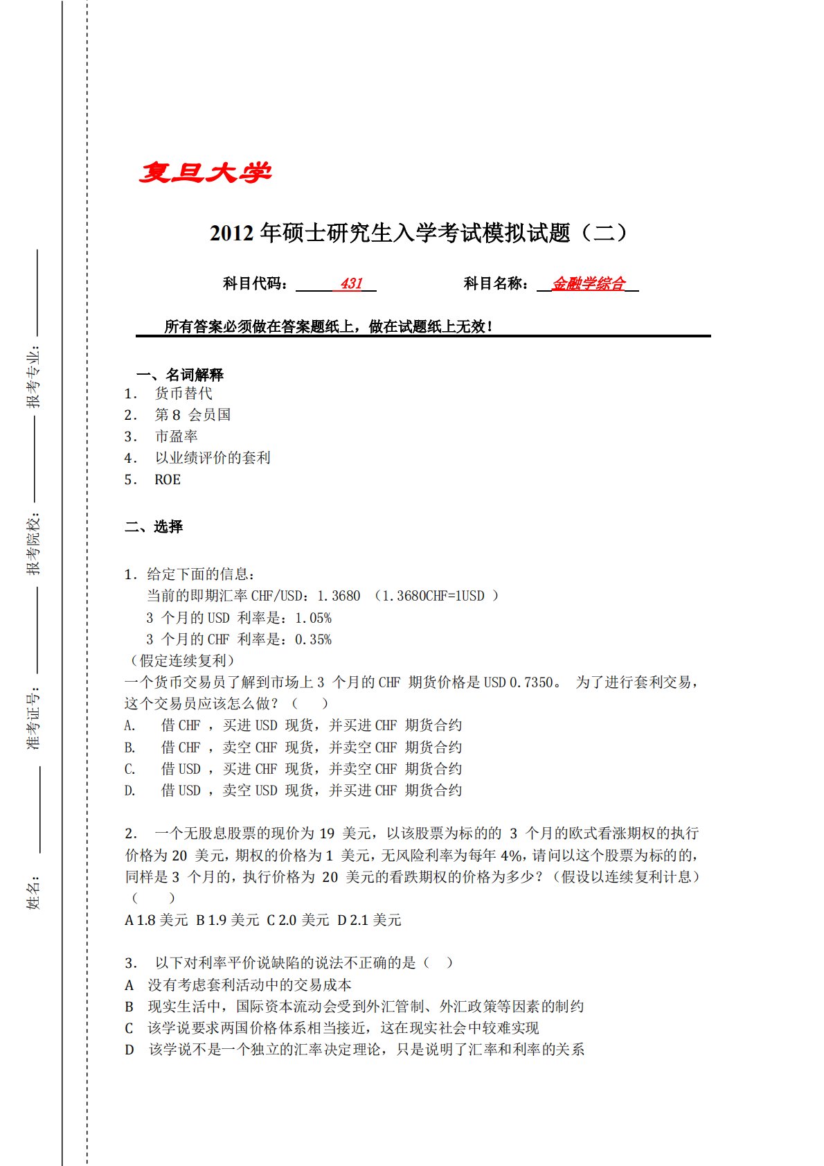 复旦大学2012年硕士研究生入学考试模拟试题(二)科目代码:431科目名称:金融学综合所有答案必须做在答案题纸上,做在试题纸上无效!1.货币替代2.第8会员国3.市盈率4.以业绩评价的套利5.一、名词解释ROE二、选择1.给定下面的信息:当前的即期汇率CHF/USD:1.3680(1.3680CHF=1USD)3个月的USD利率是:1.05%3个月的CHF利率是:0.35%(假定连续复利)一个货币交易员了解到市场上3个月的CHF期货价格是USD0.7350。为了进行套利交易,这个交易员应该怎么做?()A.借CHF,买进USD现货,并买进CHF期货合约B.借CHF,卖空CHF现货,并卖空CHF期...