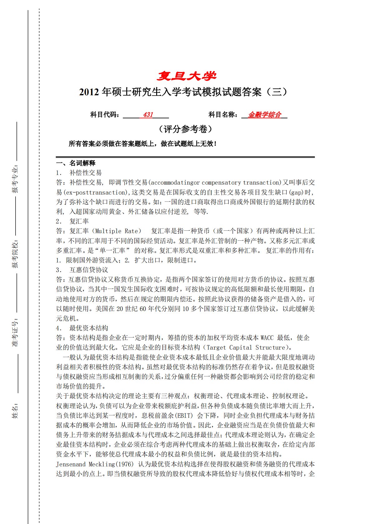 2012年硕士研究生入学考试模拟试题答案(三复旦大学)科目代码:431科目名称:金融学综合(评分参考卷)所有答案必须做在答案题纸上,做在试题纸上无效!一、名词解释1.补偿性交易答:补偿性交易,即调节性交易(accommodatingorcompensatorytransaction)又叫事后交易(ex-posttransaction),这类交易是在国际收支的自主性交易各项目发生缺口(gap)时,为了弥补这个缺口而进行的交易。如:一国的进口商取得出口商或外国银行的延期付款的权利,入超国家动用黄金、外汇储备以应付逆差,等等.2.复汇率答:复汇率(MultipleRate)复汇率是指一种货币(或一个...