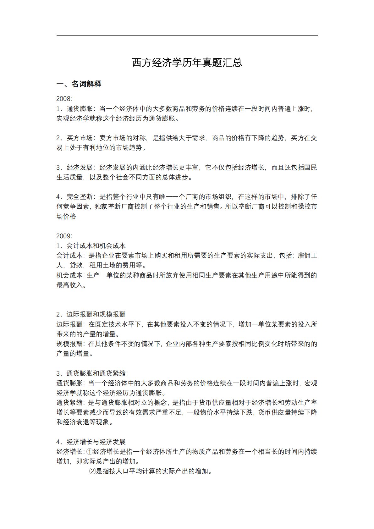 西方经济学历年真题汇总一、名词解释2008:1、通货膨胀:当一个经济体中的大多数商品和劳务的价格连续在一段时间内普遍上涨时,宏观经济学就称这个经济经历为通货膨胀。2、买方市场:卖方市场的对称,是指供给大于需求,商品的价格有下降的趋势,买方在交易上处于有利地位的市场趋势。3、经济发展:经济发展的内涵比经济增长更丰富,它不仅包括经济增长,而且还包括国民生活质量,以及整个社会不同方面的总体进步。4、完全垄断:是指整个行业中只有唯一一个厂商的市场组织,在这样的市场中,排除了任何竞争因素,独家垄断厂商控制了整个行业的生产和销售。所以垄断厂商可以控制和操控市场价格2009:1、会计成本和机会成本会计成本:...