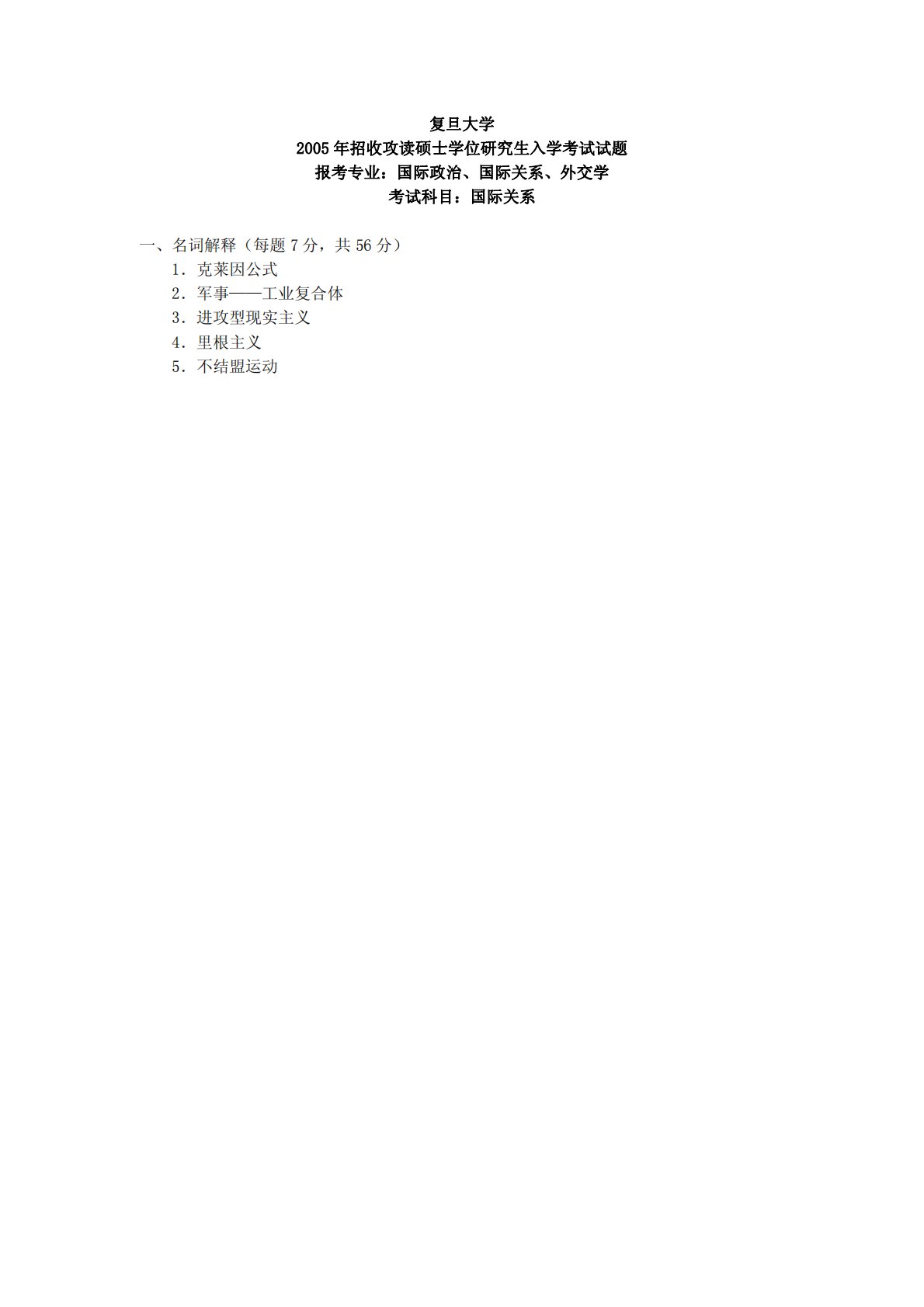 复旦大学2005年招收攻读硕士学位研究生入学考试试题报考专业:国际政治、国际关系、外交学考试科目:国际关系一、名词解释(每题7分,共56分)1.克莱因公式2.军事——工业复合体3.进攻型现实主义4.里根主义5.不结盟运动复旦大学2005年招收攻读硕士学位研究生入学考试试题报考专业:国际政治、国际关系、外交学考试科目:国际关系一、名词解释(每题7分,共56分)1.克莱因公式2.军事——工业复合体3.进攻型现实主义4.里根主义5.不结盟运动6.洛美协定7.大西洋宪章8.正义战争论二、简答题(共60分)1.简述苏联东方战线的建立及意义。(12分)2.国际关系组织化对民族国家的挑战。(12分)3.60...
