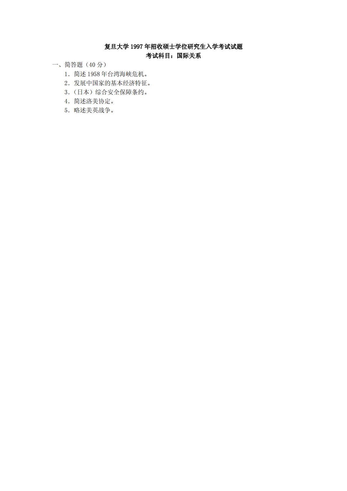 复旦大学1997年招收硕士学位研究生入学考试试题考试科目:国际关系一、简答题(40分)1.简述1958年台湾海峡危机。2.发展中国家的基本经济特征。3.(日本)综合安全保障条约。4.简述洛美协定。5.略述美英战争。复旦大学1997年招收硕士学位研究生入学考试试题考试科目:国际关系一、简答题(40分)1.简述1958年台湾海峡危机。2.发展中国家的基本经济特征。3.(日本)综合安全保障条约。4.简述洛美协定。5.略述美英战争。6.简述三国同盟。7.第三帝国8.大东亚共荣圈二、论述题(60分)1.评述冷战结束后美俄对外战略的调整。2.试述中国恢复在联合国合法席位的重要意义。3.评发展中国家争取建立...