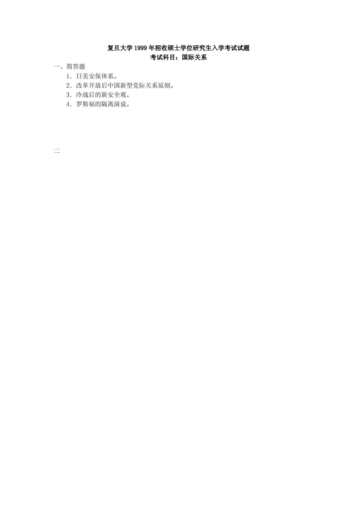 复旦大学1999年招收硕士学位研究生入学考试试题考试科目:国际关系一、简答题1.日美安保体系。2.改革开放后中国新型党际关系原则。3.冷战后的新安全观。4.罗斯福的隔离演说。二复旦大学1999年招收硕士学位研究生入学考试试题考试科目:国际关系一、简答题1.日美安保体系。2.改革开放后中国新型党际关系原则。3.冷战后的新安全观。4.罗斯福的隔离演说。5.相互依存的敏感性。6.大国关系伙伴热。7.和平共处五项原则。8.国际关系行为主体应具备的条件二、论述题1.试论20时代30年代国际关系的变化。2.试论“一国两制”与香港回归的重要意义。3.新科技革命对21世纪国际关系有何影响?百校文库—海量高校资...