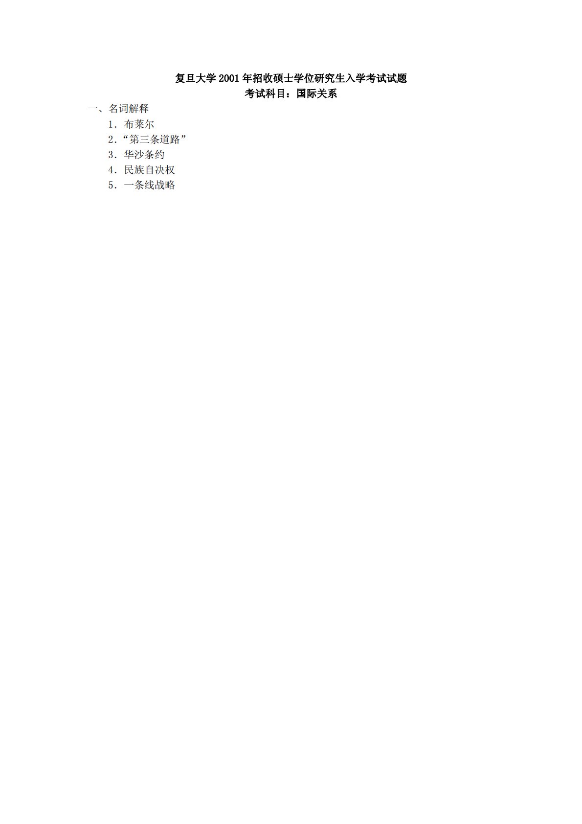 复旦大学2001年招收硕士学位研究生入学考试试题考试科目:国际关系一、名词解释1.布莱尔2.“第三条道路”3.华沙条约4.民族自决权5.一条线战略复旦大学2001年招收硕士学位研究生入学考试试题考试科目:国际关系一、名词解释1.布莱尔2.“第三条道路”3.华沙条约4.民族自决权5.一条线战略6.欧共体和马斯特里赫特条约7.苏伊士运河危机二、简答题1.简述不结盟运动的基础。2.简述人权和主权的关系。3.简述冷战后中国与西欧关系的原则。4.简述北约布鲁塞尔条约"双轨"政策的内容和目的。三、论述题1.试论冷战前后中美关系的战略基础的演变。2.试论二十世纪三十年代欧洲国际关系的基本特征。3.试述二十世...