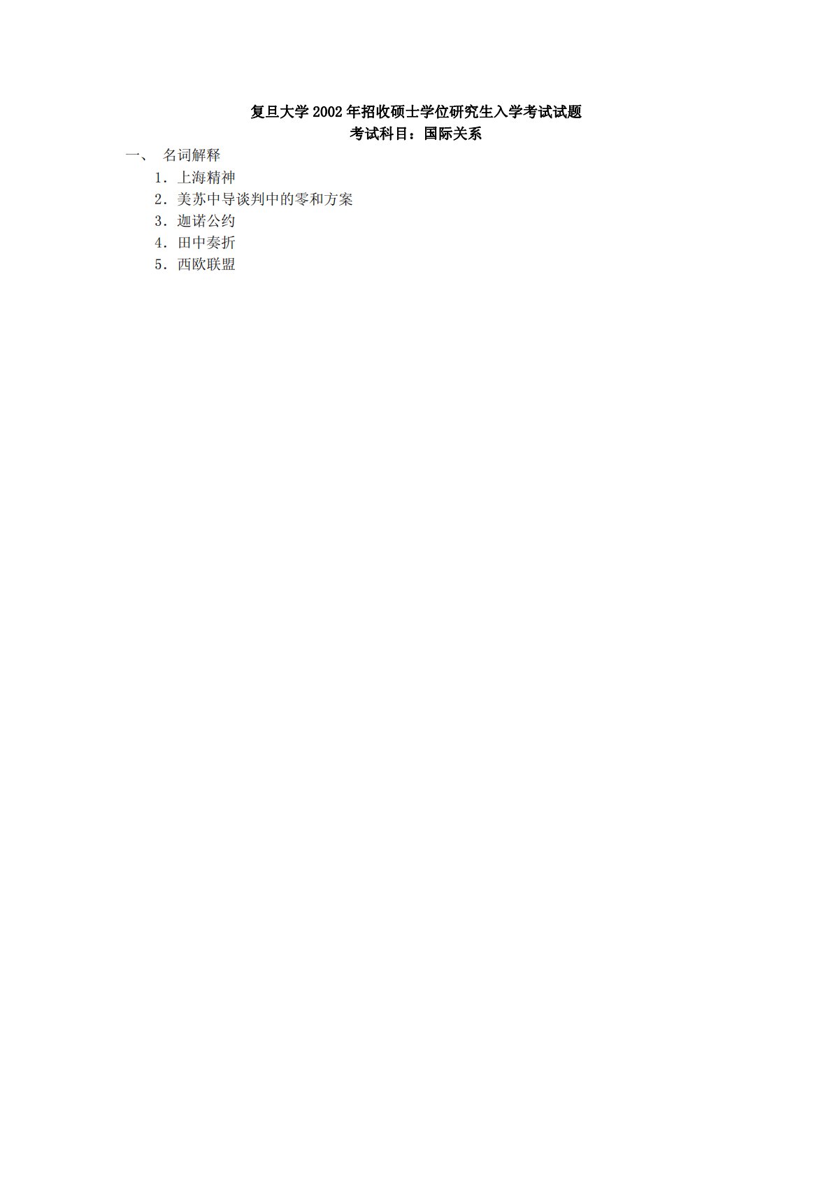 复旦大学2002年招收硕士学位研究生入学考试试题考试科目:国际关系一、名词解释1.上海精神2.美苏中导谈判中的零和方案3.迦诺公约4.田中奏折5.西欧联盟复旦大学2002年招收硕士学位研究生入学考试试题考试科目:国际关系一、名词解释1.上海精神2.美苏中导谈判中的零和方案3.迦诺公约4.田中奏折5.西欧联盟6.埃以戴维营协议二、简答题1.简述二战后西方发达国家间关系的基本特征。2.简述新马克思主义者关于经济全球化的主要观点。3.简述二十世纪七十年代东西方关系缓和的主要成果。三、论述题1.论述冷战后中国的伙伴关系战略。2.试述二战期间雅尔塔会议及其他一些会议对战后世界秩序的安排及其实质。3.论述...