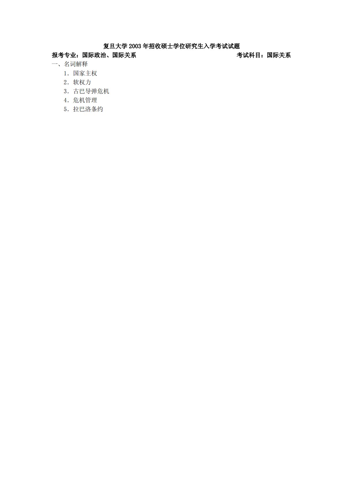 复旦大学2003年招收硕士学位研究生入学考试试题报考专业:国际政治、国际关系考试科目:国际关系一、名词解释1.国家主权2.软权力3.古巴导弹危机4.危机管理5.拉巴洛条约复旦大学2003年招收硕士学位研究生入学考试试题报考专业:国际政治、国际关系考试科目:国际关系一、名词解释1.国家主权2.软权力3.古巴导弹危机4.危机管理5.拉巴洛条约6.蒙巴顿条约7.世界体系理论8.民主和平论9.与台湾关系法二、简答题1.一战后的主要国际社会格局。2.全球化条件下国家利益的变化及其在国际社会中的作用。3.雅尔塔体系对世界秩序的安排及其对战后国际关系的影响。三、论述题1.中国和国际组织的关系变化。2.冷战后...