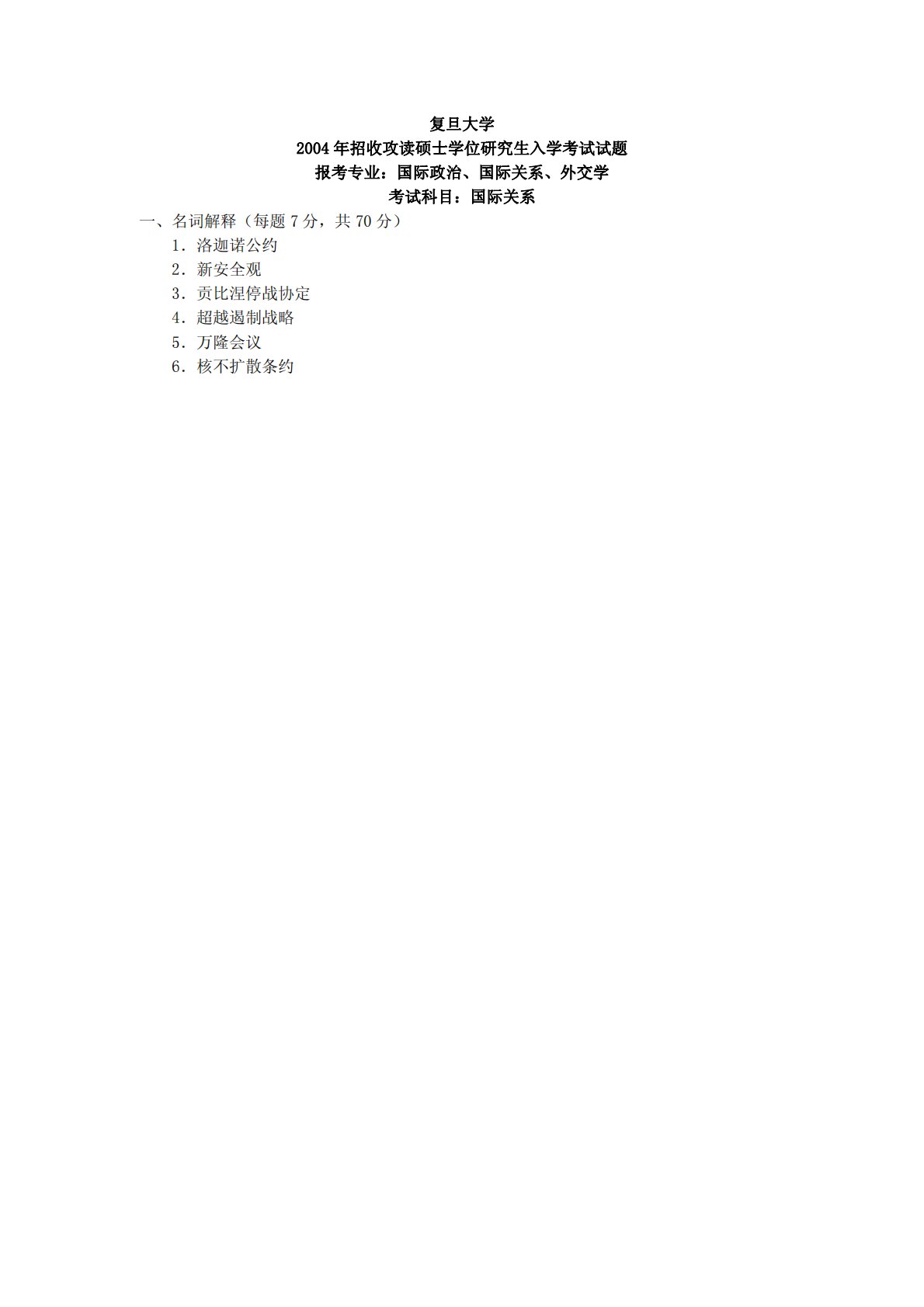 复旦大学2004年招收攻读硕士学位研究生入学考试试题报考专业:国际政治、国际关系、外交学考试科目:国际关系一、名词解释(每题7分,共70分)1.洛迦诺公约2.新安全观3.贡比涅停战协定4.超越遏制战略5.万隆会议6.核不扩散条约复旦大学2004年招收攻读硕士学位研究生入学考试试题报考专业:国际政治、国际关系、外交学考试科目:国际关系一、名词解释(每题7分,共70分)1.洛迦诺公约2.新安全观3.贡比涅停战协定4.超越遏制战略5.万隆会议6.核不扩散条约7.开罗宣言8.斯大林格勒保卫战9.苏曼计划10.中美8.17公报二、威尔逊主义的内容、实质、影响。(25分)三、试从“哈尔斯坦主义”到“新东方...