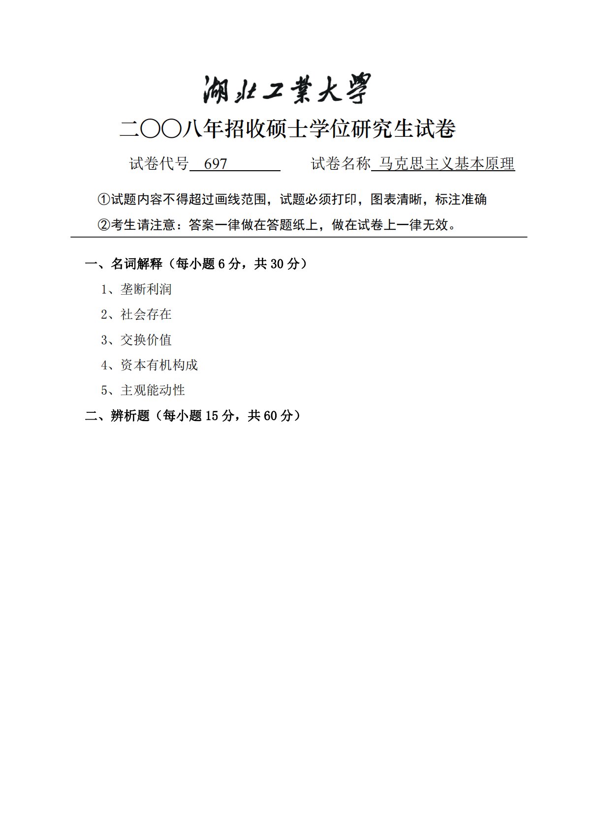 二○○八年招收硕士学位研究生试卷试卷代号697试卷名称马克思主义基本原理①试题内容不得超过画线范围,试题必须打印,图表清晰,标注准确②考生请注意:答案一律做在答题纸上,做在试卷上一律无效。一、名词解释(每小题6分,共30分)1、垄断利润2、社会存在3、交换价值4、资本有机构成5、主观能动性二、辨析题(每小题15分,共60分)二○○八年招收硕士学位研究生试卷试卷代号697试卷名称马克思主义基本原理①试题内容不得超过画线范围,试题必须打印,图表清晰,标注准确②考生请注意:答案一律做在答题纸上,做在试卷上一律无效。第1页共1页一、名词解释(每小题6分,共30分)1、垄断利润2、社会存在3、交换价值4...