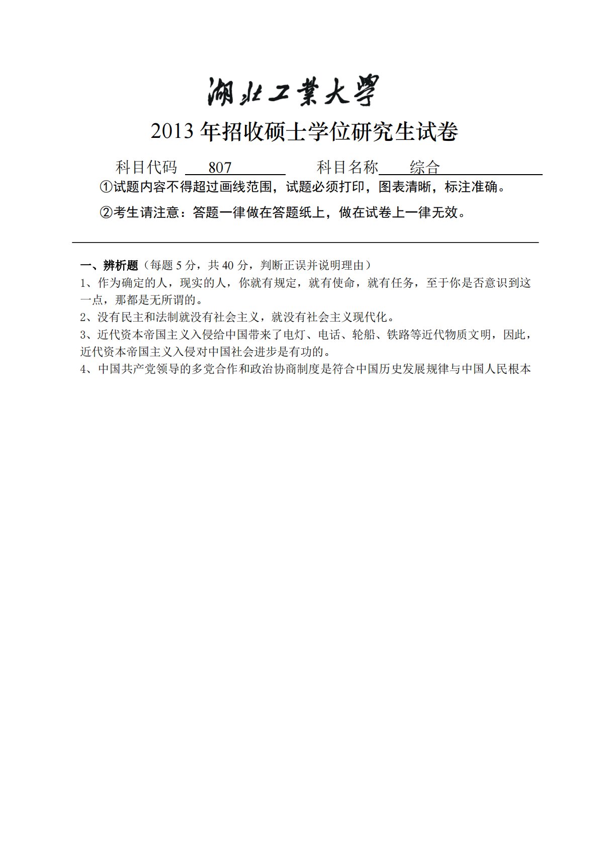 2013年招收硕士学位研究生试卷科目代码807科目名称综合①试题内容不得超过画线范围,试题必须打印,图表清晰,标注准确。②考生请注意:答题一律做在答题纸上,做在试卷上一律无效。一、辨析题(每题5分,共40分,判断正误并说明理由)1、作为确定的人,现实的人,你就有规定,就有使命,就有任务,至于你是否意识到这一点,那都是无所谓的。2、没有民主和法制就没有社会主义,就没有社会主义现代化。3、近代资本帝国主义入侵给中国带来了电灯、电话、轮船、铁路等近代物质文明,因此,近代资本帝国主义入侵对中国社会进步是有功的。4、中国共产党领导的多党合作和政治协商制度是符合中国历史发展规律与中国人民根本2013年招收...