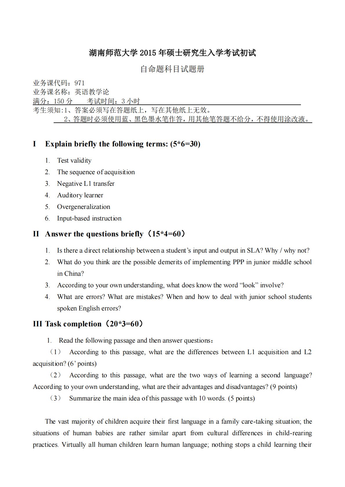 湖南师范大学2015年硕士研究生入学考试初试自命题科目试题册业务课代码:971业务课名称:英语教学论满分:150分考试时间:3小时考生须知:1、答案必须写在答题纸上,写在其他纸上无效。2、答题时必须使用蓝、黑色墨水笔作答,用其他笔答题不给分,不得使用涂改液。IExplainbrieflythefollowingterms:(5*6=30)1.Testvalidity2.Thesequenceofacquisition3.NegativeL1transfer4.Auditorylearner5.Overgeneralization6.Input-basedinstructionIIAnswert...