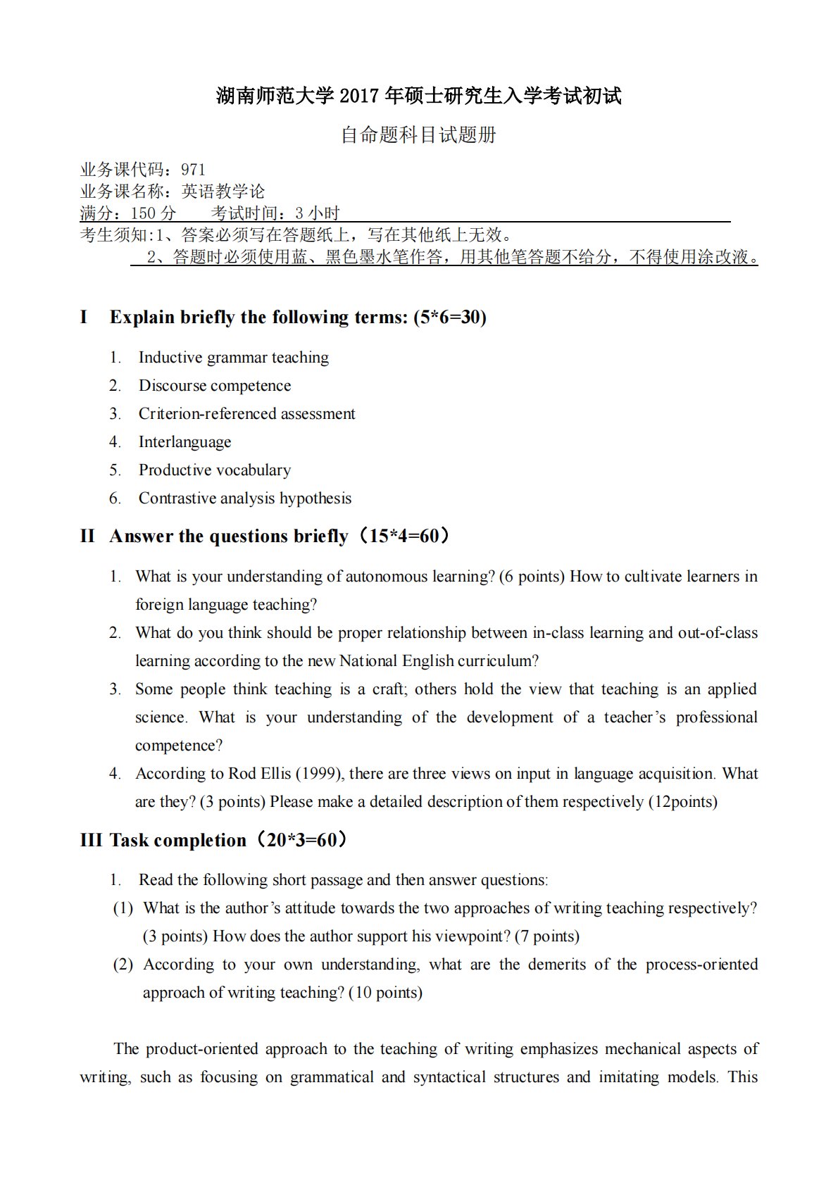 湖南师范大学2017年硕士研究生入学考试初试自命题科目试题册业务课代码:971业务课名称:英语教学论满分:150分考试时间:3小时考生须知:1、答案必须写在答题纸上,写在其他纸上无效。2、答题时必须使用蓝、黑色墨水笔作答,用其他笔答题不给分,不得使用涂改液。IExplainbrieflythefollowingterms:(5*6=30)1.Inductivegrammarteaching2.Discoursecompetence3.Criterion-referencedassessment4.Interlanguage5.Productivevocabulary6.Contrastivea...