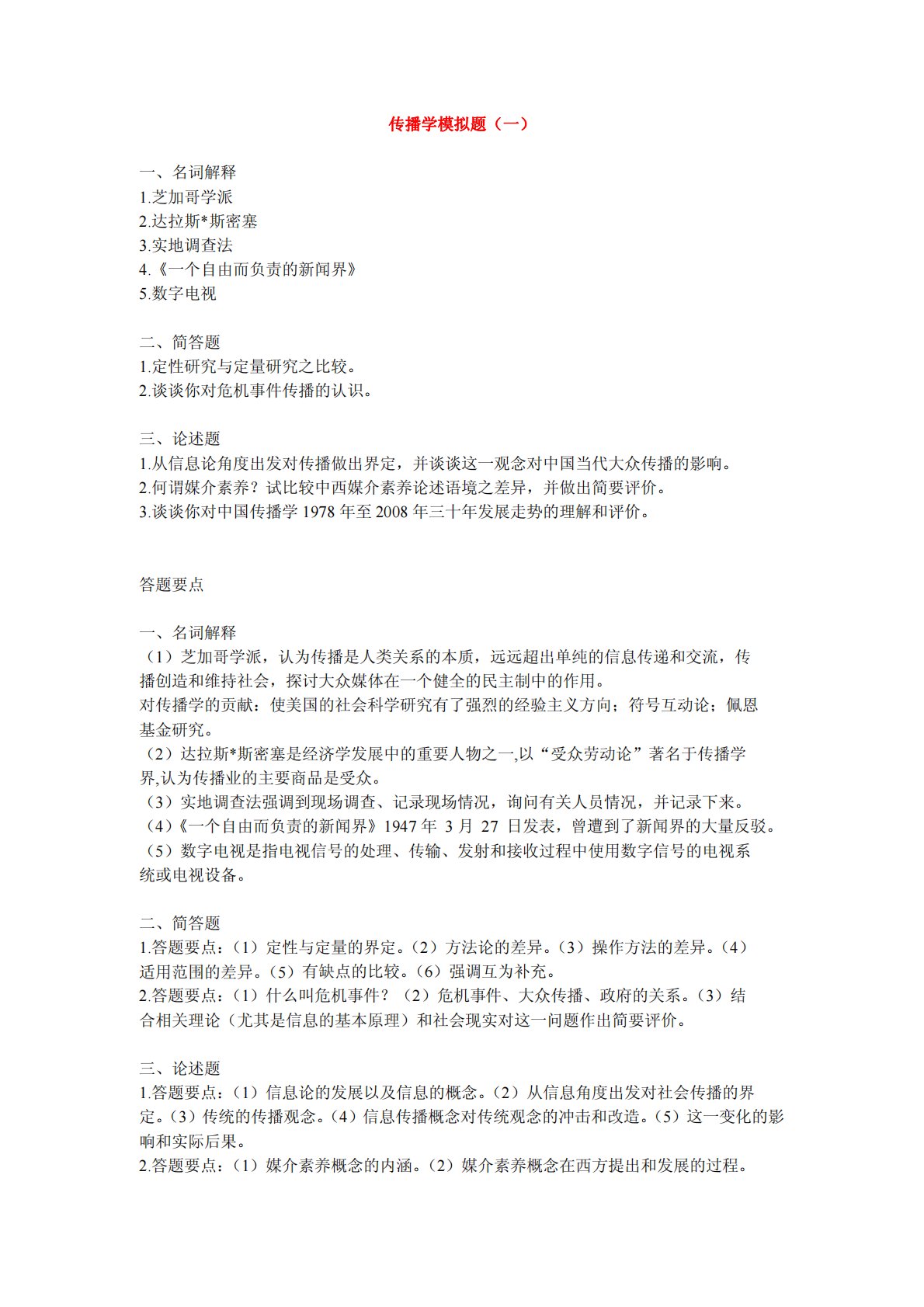 传播学模拟题(一)一、名词解释1.芝加哥学派2.达拉斯*斯密塞3.实地调查法4.《一个自由而负责的新闻界》5.数字电视二、简答题1.定性研究与定量研究之比较。2.谈谈你对危机事件传播的认识。三、论述题1.从信息论角度出发对传播做出界定,并谈谈这一观念对中国当代大众传播的影响。2.何谓媒介素养?试比较中西媒介素养论述语境之差异,并做出简要评价。3.谈谈你对中国传播学1978年至2008年三十年发展走势的理解和评价。答题要点一、名词解释(1)芝加哥学派,认为传播是人类关系的本质,远远超出单纯的信息传递和交流,传播创造和维持社会,探讨大众媒体在一个健全的民主制中的作用。对传播学的贡献:使美国的社会科...