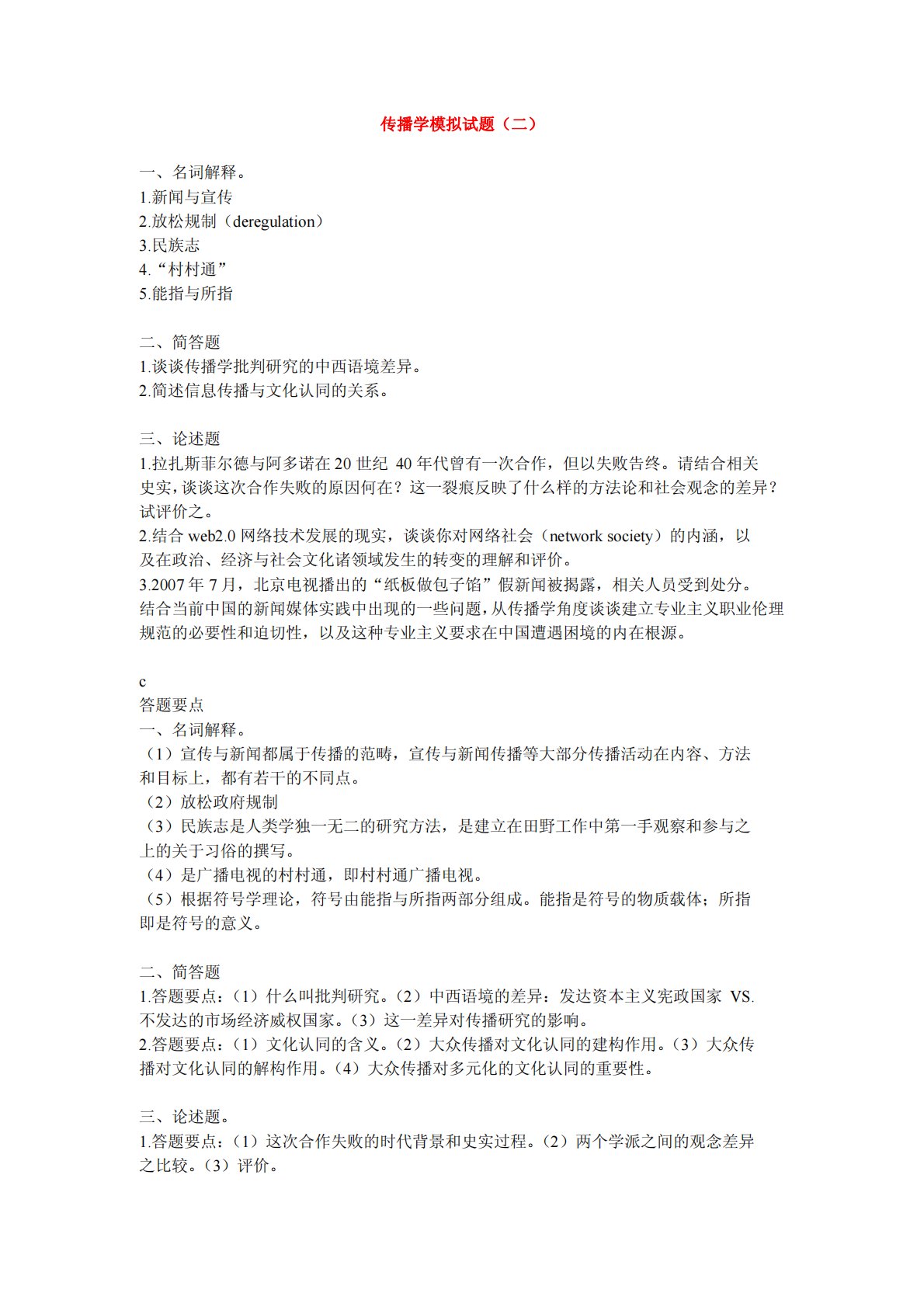 传播学模拟试题(二)一、名词解释。1.新闻与宣传2.放松规制(deregulation)3.民族志4.“村村通”5.能指与所指二、简答题1.谈谈传播学批判研究的中西语境差异。2.简述信息传播与文化认同的关系。三、论述题1.拉扎斯菲尔德与阿多诺在20世纪40年代曾有一次合作,但以失败告终。请结合相关史实,谈谈这次合作失败的原因何在?这一裂痕反映了什么样的方法论和社会观念的差异?试评价之。2.结合web2.0网络技术发展的现实,谈谈你对网络社会(networksociety)的内涵,以及在政治、经济与社会文化诸领域发生的转变的理解和评价。3.2007年7月,北京电视播出的“纸板做包子馅”假新闻被揭...