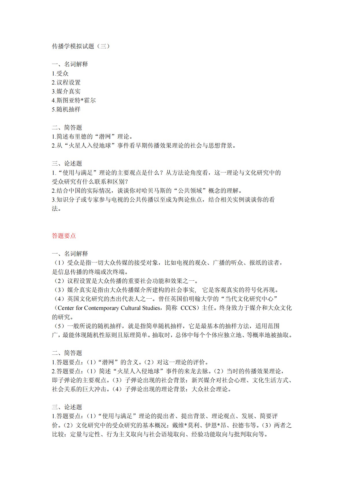 传播学模拟试题(三)一、名词解释1.受众2.议程设置3.媒介真实4.斯图亚特*霍尔5.随机抽样二、简答题1.简述布里德的“潜网”理论。2.从“火星人入侵地球”事件看早期传播效果理论的社会与思想背景。三、论述题1.“使用与满足”理论的主要观点是什么?从方法论角度看,这一理论与文化研究中的受众研究有什么联系和区别?2.结合中国的实际情况,谈谈你对哈贝马斯的“公共领域”概念的理解。3.知识分子或专家参与电视的公共传播以至成为舆论焦点,结合相关实例谈谈你的看法。答题要点一、名词解释(1)受众是指一切大众传媒的接受对象,比如电视的观众、广播的听众、报纸的读者,是信息传播的终端或次终端。(2)议程设置是大...