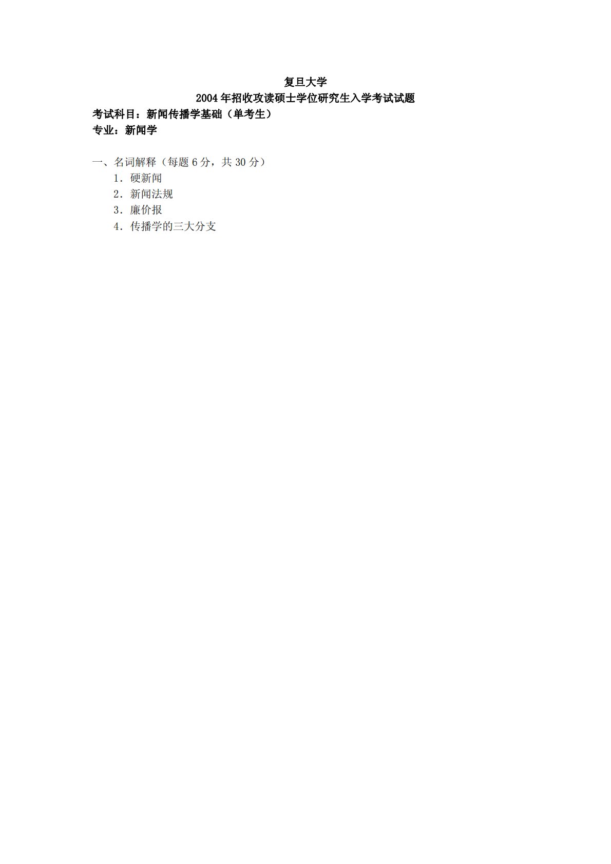 复旦大学2004年招收攻读硕士学位研究生入学考试试题考试科目:新闻传播学基础(单考生)专业:新闻学一、名词解释(每题6分,共30分)1.硬新闻2.新闻法规3.廉价报4.传播学的三大分支复旦大学2004年招收攻读硕士学位研究生入学考试试题考试科目:新闻传播学基础(单考生)专业:新闻学一、名词解释(每题6分,共30分)1.硬新闻2.新闻法规3.廉价报4.传播学的三大分支5.《中国报学史》二、简答题(每题15分,共30分)1.新闻传媒的社会功能有哪些?2.什么是议程设置?三、论述题(每题45分,共90分)1.结合中国新闻传媒发展现状,阐述竞争对新闻传媒业发展的意义和影响。2.经过1942-1945年...