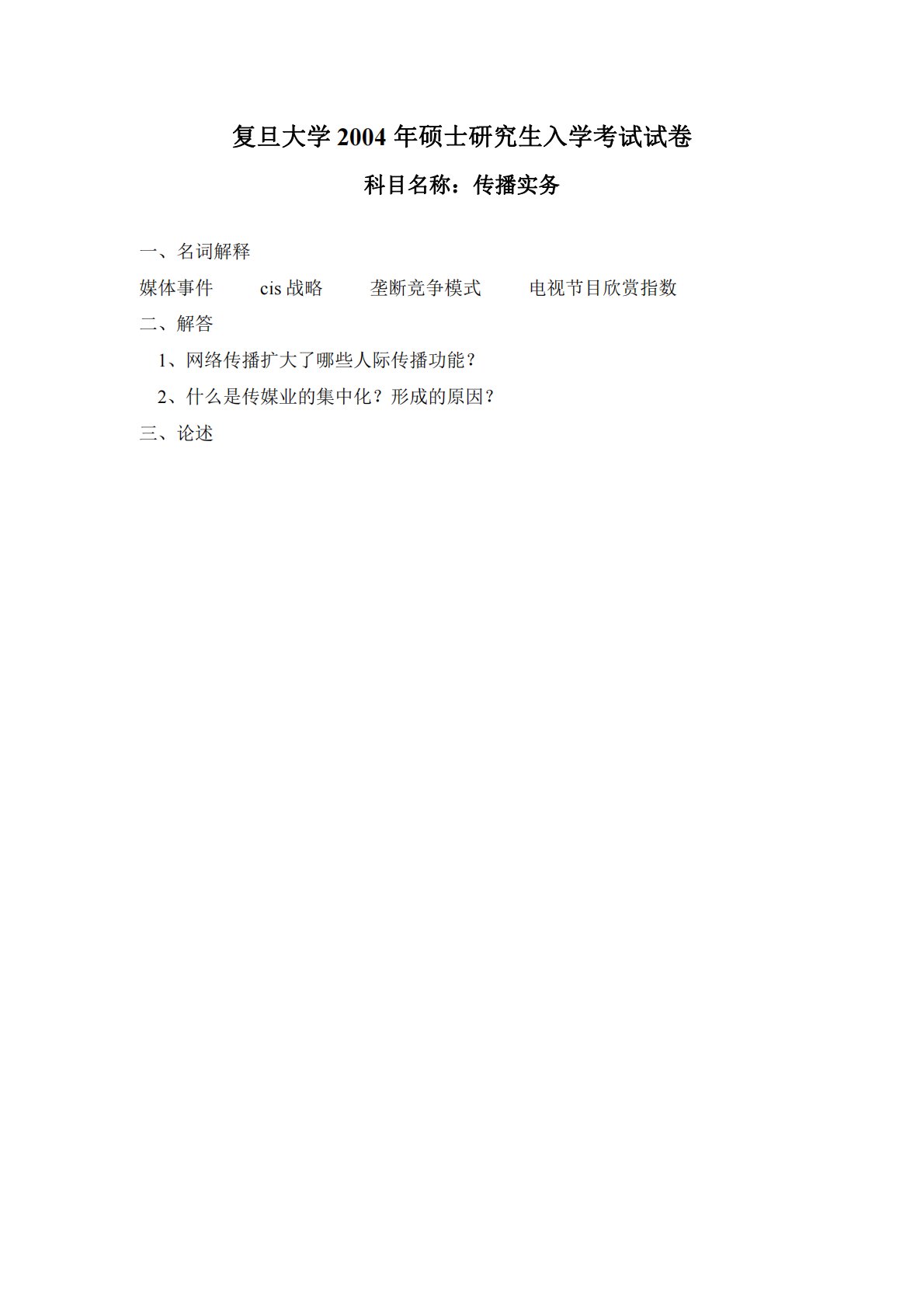 复旦大学2004年硕士研究生入学考试试卷科目名称:传播实务一、名词解释媒体事件cis战略垄断竞争模式电视节目欣赏指数二、解答1、网络传播扩大了哪些人际传播功能?2、什么是传媒业的集中化?形成的原因?三、论述复旦大学2004年硕士研究生入学考试试卷科目名称:传播实务一、名词解释媒体事件cis战略垄断竞争模式电视节目欣赏指数二、解答1、网络传播扩大了哪些人际传播功能?2、什么是传媒业的集中化?形成的原因?三、论述1、言语传播在公共关系中的运用,有哪些长处和短处?2、作为网络媒体的“把关人”,除了遵守传统媒体的原则以外还应该注意哪些问题3、从经营管理的角度看中国媒体业目前存在的问题四、综合给出资料(...