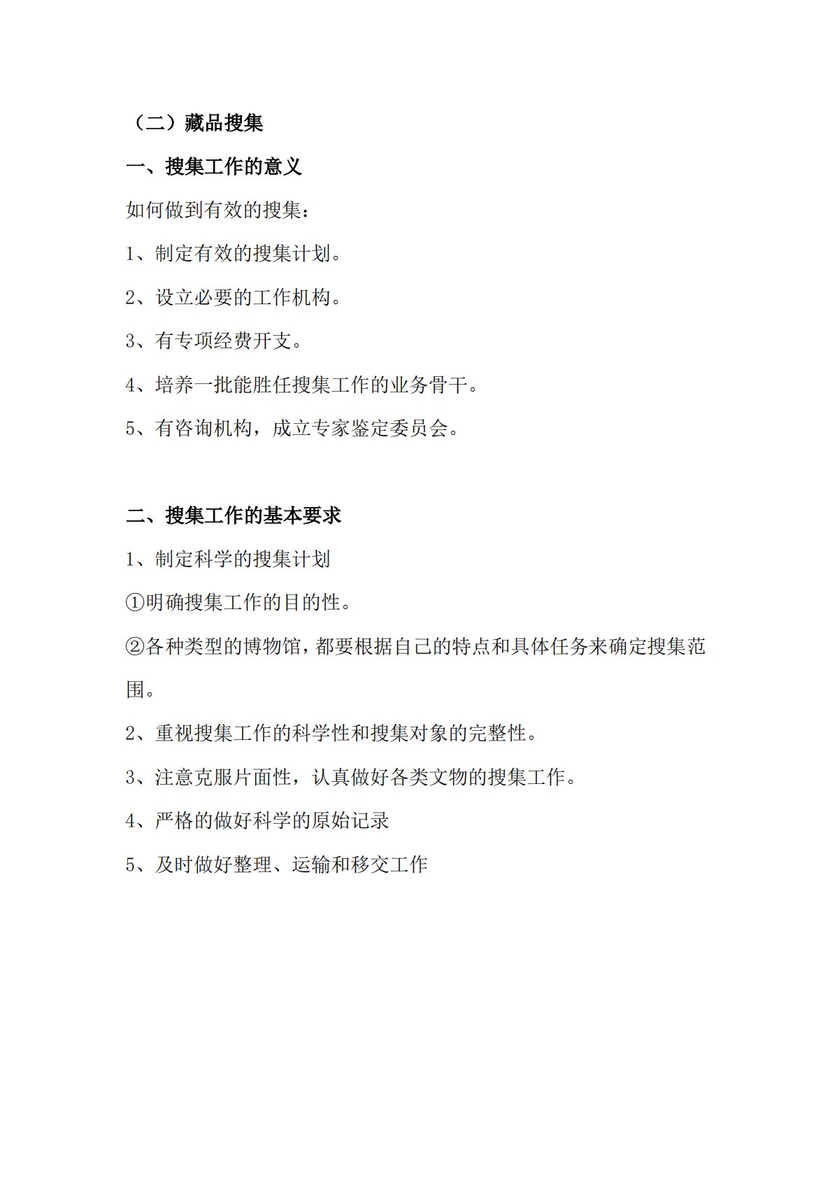 (二)藏品搜集一、搜集工作的意义如何做到有效的搜集:1、制定有效的搜集计划。2、设立必要的工作机构。3、有专项经费开支。4、培养一批能胜任搜集工作的业务骨干。5、有咨询机构,成立专家鉴定委员会。二、搜集工作的基本要求1、制定科学的搜集计划①明确搜集工作的目的性。②各种类型的博物馆,都要根据自己的特点和具体任务来确定搜集范围。2、重视搜集工作的科学性和搜集对象的完整性。3、注意克服片面性,认真做好各类文物的搜集工作。4、严格的做好科学的原始记录5、及时做好整理、运输和移交工作三、搜集工作的途径和方法1、社会搜集:系博物馆藏品征集的途径之一。是指对流散在社会、民间的各种文物、标本资料的征集。1馆际...