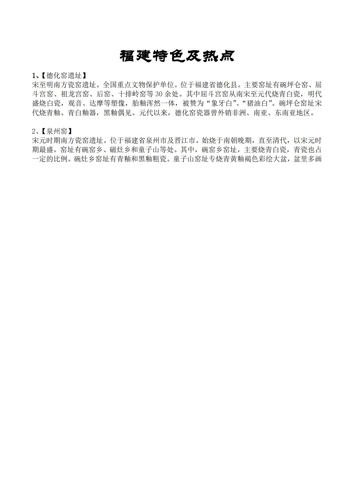 福建特色及热点1、【德化窑遗址】宋至明南方瓷窑遗址。全国重点文物保护单位。位于福建省德化县。主要窑址有碗坪仑窑、屈斗宫窑、祖龙宫窑、后窑、十排岭窑等30余处。其中屈斗宫窑从南宋至元代烧青白瓷,明代盛烧白瓷,观音、达摩等塑像,胎釉浑然一体,被赞为“象牙白”、“猪油白”。碗坪仑窑址宋代烧青釉、青白釉器,黑釉偶见。元代以来,德化窑瓷器曾外销非洲、南亚、东南亚地区。2、【泉州窑】宋元时期南方瓷窑遗址。位于福建省泉州市及晋江市。始烧于南朝晚期,直至清代,以宋元时期最盛。窑址有碗窑乡、磁灶乡和童子山等处。其中,碗窑乡窑址,主要烧青白瓷,青瓷也占一定的比例。碗灶乡窑址有青釉和黑釉粗瓷。童子山窑址专烧青黄釉褐...