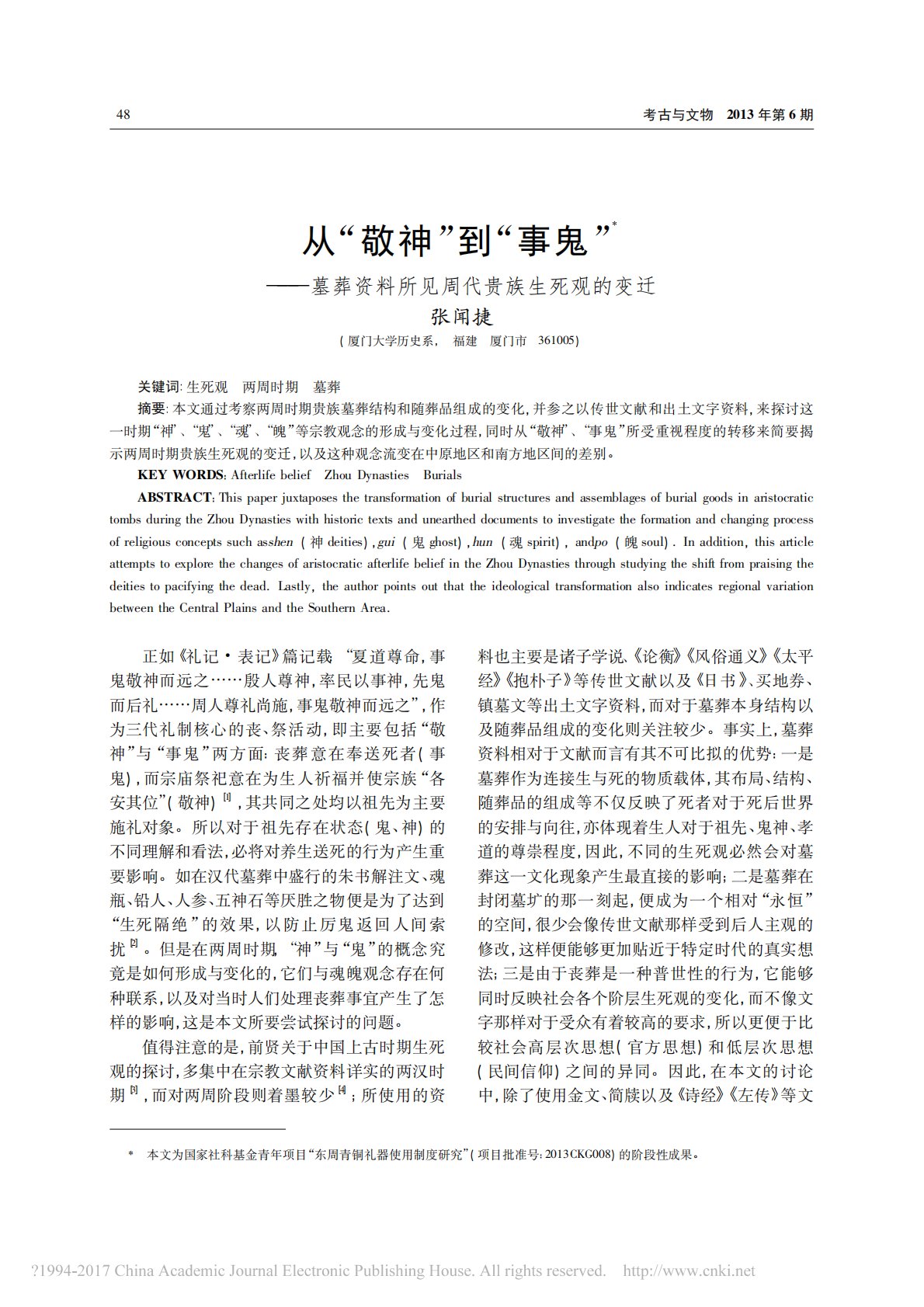 ´Ó“¾´Éñ”µ½“ʹí”*———ĹÔá×ÊÁÏËù¼ûÖÜ´ú¹ó×åÉúËÀ¹ÛµÄ±äǨÕÅÎŽÝ(ÏÃÃÅ´óѧÀúʷϵ£¬¸£½¨ÏÃÃÅÊÐ361005)¹Ø¼ü´Ê:ÉúËÀ¹ÛÁ½ÖÜʱÆÚĹÔáժҪ:±¾ÎÄͨ¹ý¿¼²ìÁ½ÖÜʱÆÚ¹ó×åĹÔá½á¹¹ºÍËæÔáÆ·×é³ÉµÄ±ä»¯£¬²¢²ÎÖ®ÒÔ´«ÊÀÎÄÏ׺ͳöÍÁÎÄ×Ö×ÊÁÏ£¬À´̽ÌÖÕâһʱÆÚ“Éñ”、“¹í”、“»ê”、“ÆÇ”µÈ×ڽ̹ÛÄîµÄÐγÉÓë±ä»¯¹ý³Ì£¬Í¬Ê±´Ó“¾´Éñ”、“ʹí”ËùÊÜÖØÊӳ̶ȵÄתÒ...