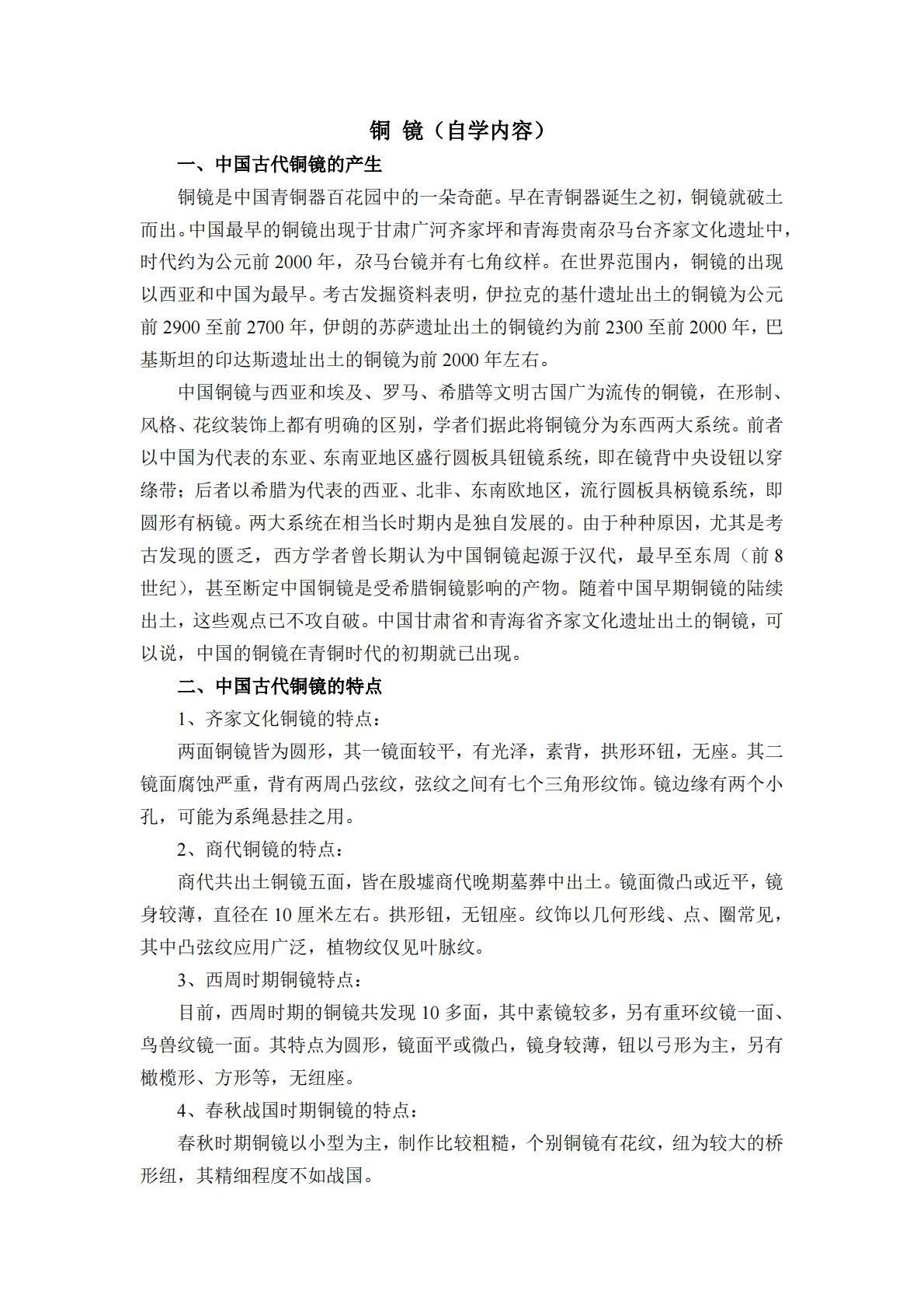 铜镜(自学内容)一、中国古代铜镜的产生铜镜是中国青铜器百花园中的一朵奇葩。早在青铜器诞生之初,铜镜就破土而出。中国最早的铜镜出现于甘肃广河齐家坪和青海贵南尕马台齐家文化遗址中,时代约为公元前2000年,尕马台镜并有七角纹样。在世界范围内,铜镜的出现以西亚和中国为最早。考古发掘资料表明,伊拉克的基什遗址出土的铜镜为公元前2900至前2700年,伊朗的苏萨遗址出土的铜镜约为前2300至前2000年,巴基斯坦的印达斯遗址出土的铜镜为前2000年左右。中国铜镜与西亚和埃及、罗马、希腊等文明古国广为流传的铜镜,在形制、风格、花纹装饰上都有明确的区别,学者们据此将铜镜分为东西两大系统。前者以中国为代表的东...
