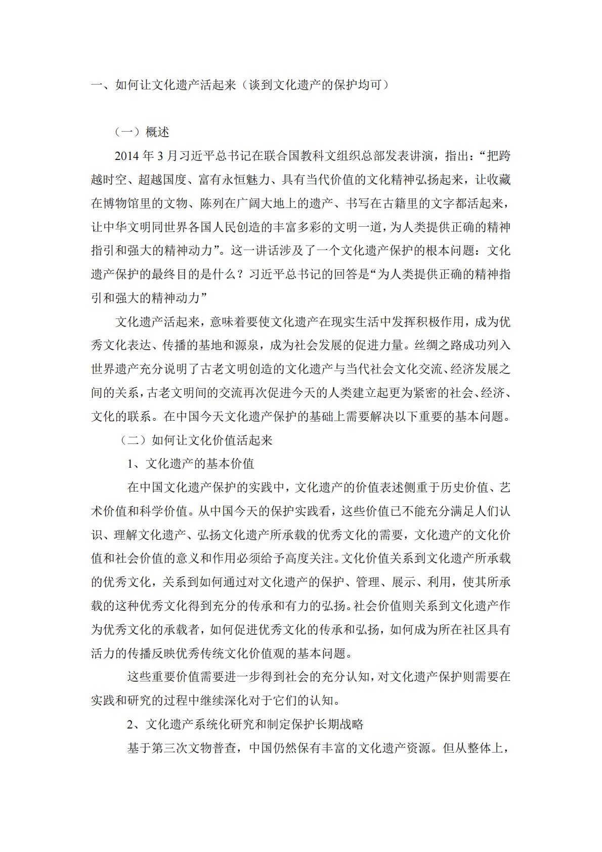 一、如何让文化遗产活起来(谈到文化遗产的保护均可)(一)概述2014年3月习近平总书记在联合国教科文组织总部发表讲演,指出:“把跨越时空、超越国度、富有永恒魅力、具有当代价值的文化精神弘扬起来,让收藏在博物馆里的文物、陈列在广阔大地上的遗产、书写在古籍里的文字都活起来,让中华文明同世界各国人民创造的丰富多彩的文明一道,为人类提供正确的精神指引和强大的精神动力”。这一讲话涉及了一个文化遗产保护的根本问题:文化遗产保护的最终目的是什么?习近平总书记的回答是“为人类提供正确的精神指引和强大的精神动力”文化遗产活起来,意味着要使文化遗产在现实生活中发挥积极作用,成为优秀文化表达、传播的基地和源泉,成为...