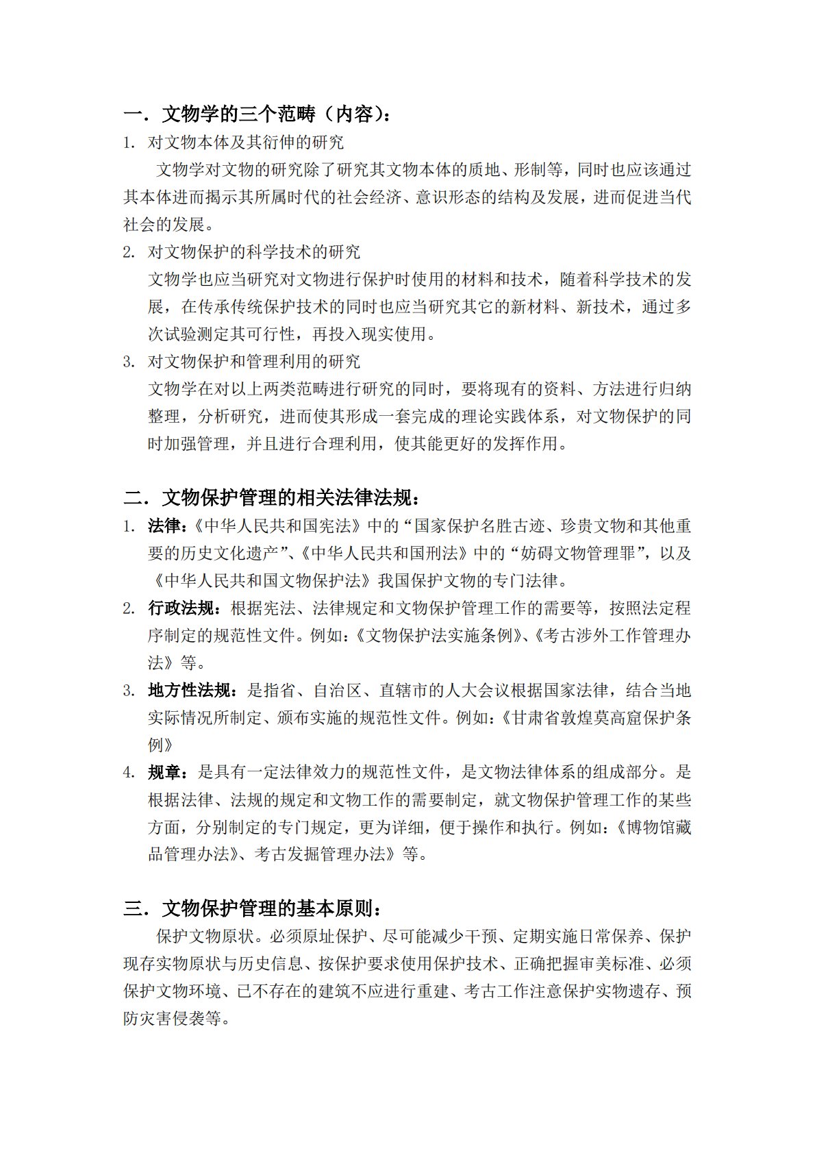 一.文物学的三个范畴(内容):1.对文物本体及其衍伸的研究文物学对文物的研究除了研究其文物本体的质地、形制等,同时也应该通过其本体进而揭示其所属时代的社会经济、意识形态的结构及发展,进而促进当代社会的发展。2.对文物保护的科学技术的研究文物学也应当研究对文物进行保护时使用的材料和技术,随着科学技术的发展,在传承传统保护技术的同时也应当研究其它的新材料、新技术,通过多次试验测定其可行性,再投入现实使用。3.对文物保护和管理利用的研究文物学在对以上两类范畴进行研究的同时,要将现有的资料、方法进行归纳整理,分析研究,进而使其形成一套完成的理论实践体系,对文物保护的同时加强管理,并且进行合理利用,使其...