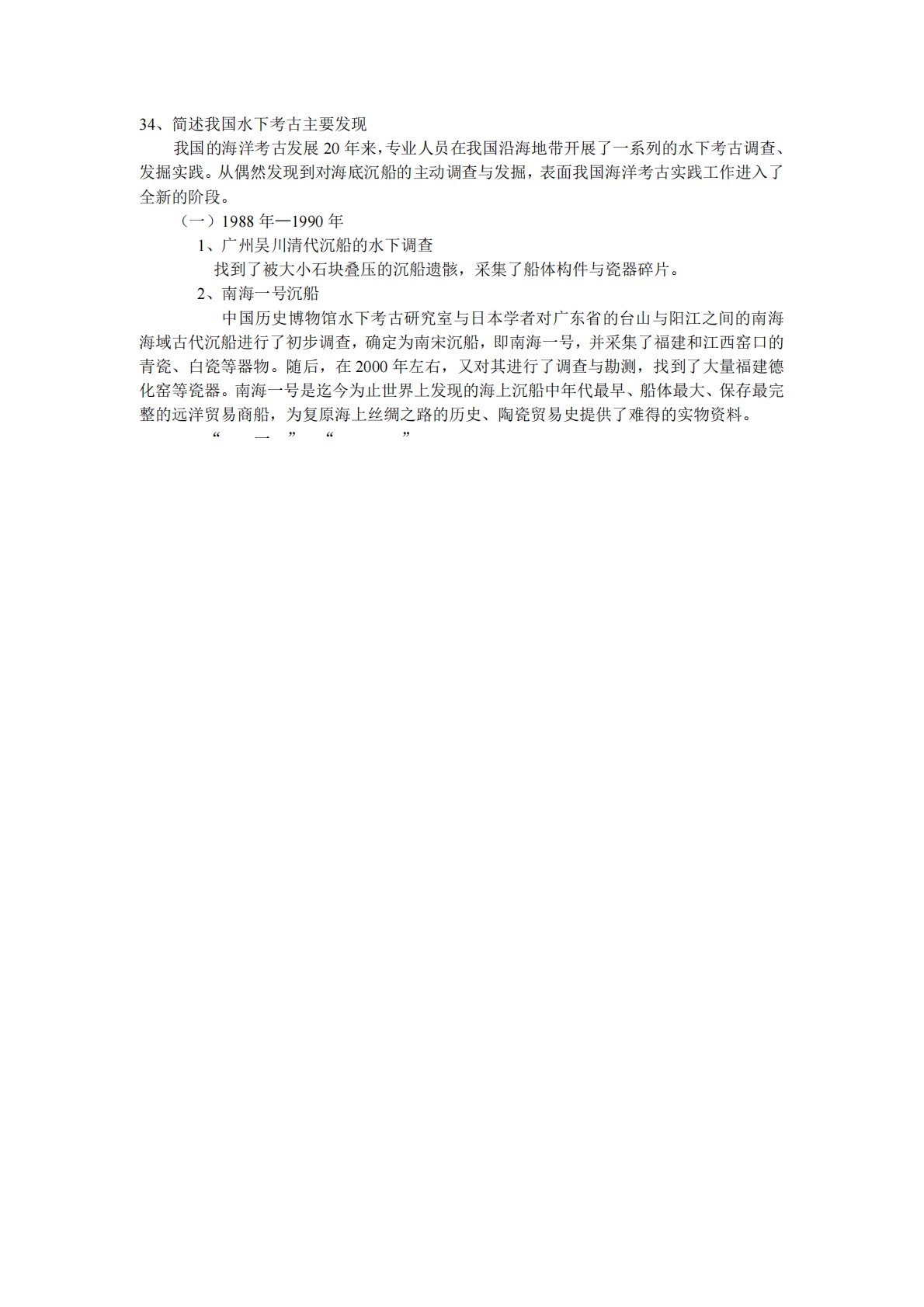 34、简述我国水下考古主要发现我国的海洋考古发展20年来,专业人员在我国沿海地带开展了一系列的水下考古调查、发掘实践。从偶然发现到对海底沉船的主动调查与发掘,表面我国海洋考古实践工作进入了全新的阶段。(一)1988年—1990年1、广州吴川清代沉船的水下调查找到了被大小石块叠压的沉船遗骸,采集了船体构件与瓷器碎片。2、南海一号沉船中国历史博物馆水下考古研究室与日本学者对广东省的台山与阳江之间的南海海域古代沉船进行了初步调查,确定为南宋沉船,即南海一号,并采集了福建和江西窑口的青瓷、白瓷等器物。随后,在2000年左右,又对其进行了调查与勘测,找到了大量福建德化窑等瓷器。南海一号是迄今为止世界上发...