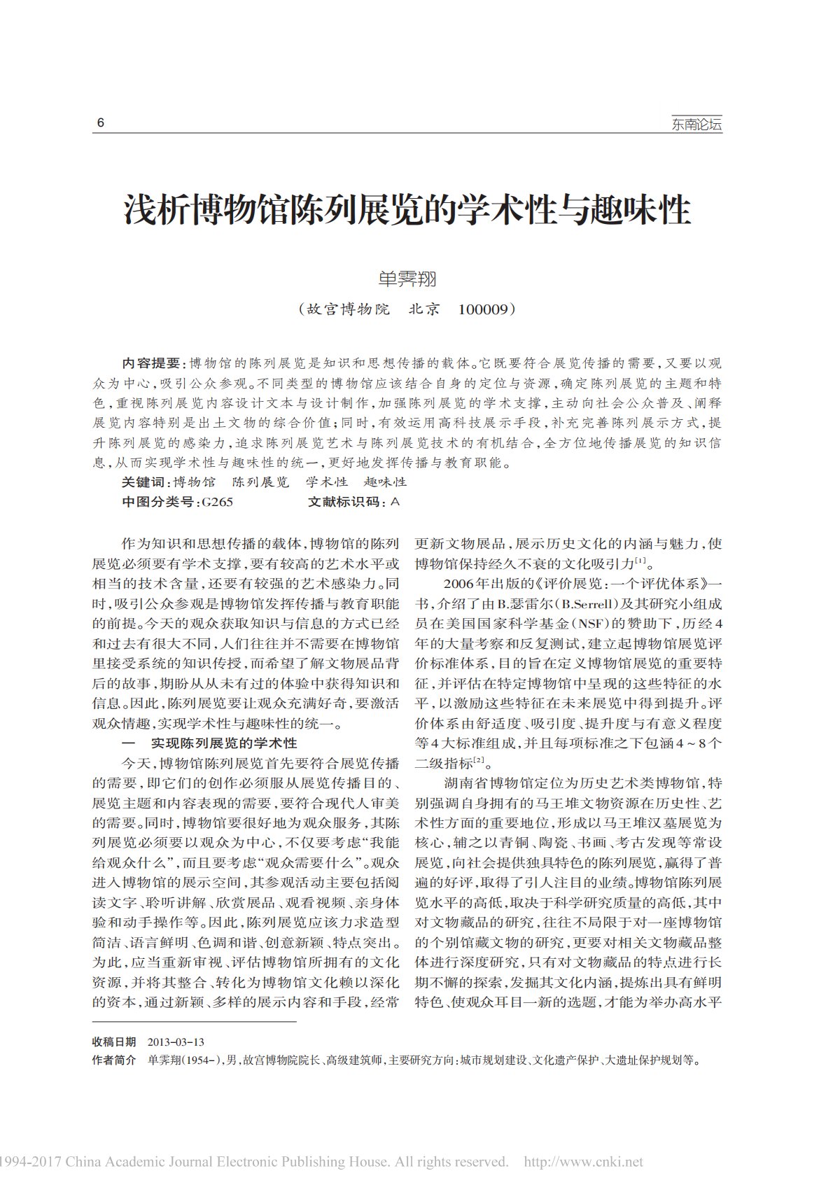 浅析博物馆陈列展览的学术性与趣味性收稿日期2013-03-13作者简介单霁翔(1954-),男,故宫博物院院长、高级建筑师,主要研究方向:城市规划建设、文化遗产保护、大遗址保护规划等。内容提要:博物馆的陈列展览是知识和思想传播的载体。它既要符合展览传播的需要,又要以观众为中心,吸引公众参观。不同类型的博物馆应该结合自身的定位与资源,确定陈列展览的主题和特色,重视陈列展览内容设计文本与设计制作,加强陈列展览的学术支撑,主动向社会公众普及、阐释展览内容特别是出土文物的综合价值;同时,有效运用高科技展示手段,补充完善陈列展示方式,提升陈列展览的感染力,追求陈列展览艺术与陈列展览技术的有机结合,全方位...