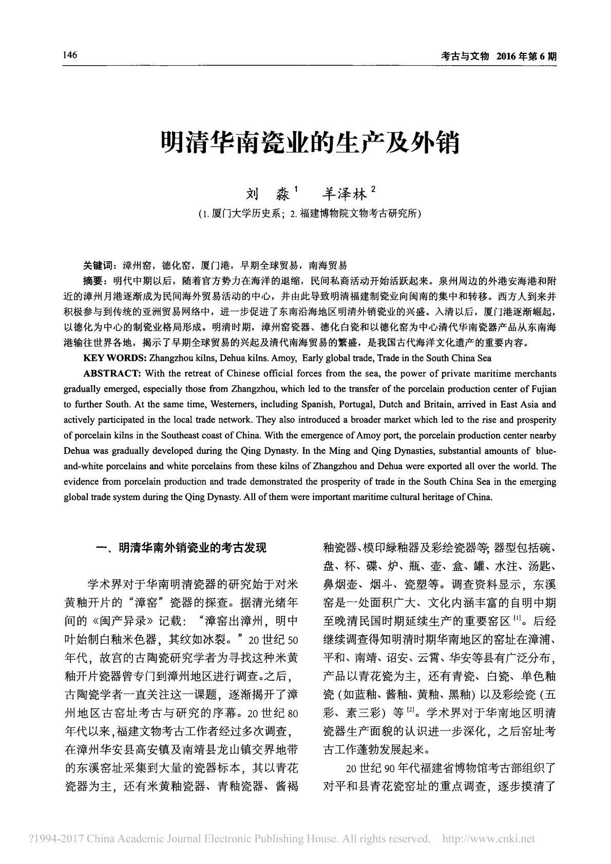 146考古与文物2016年第6期明清华南瓷业的生产及外销刘淼1羊泽林2(1.厦门大学历史系;2.福建博物院文物考古研究所)关键词:漳州密,德化密,厦门港,早期全球贸易,南海贸易摘要:明代中期以后,随着官方势力在海洋的退缩,民间私商活动开始活跃起来。泉州周边的外港安海港和附近的漳州月港逐渐成为民间海外贸易活动的中心,并由此导致明清福建制瓷业向闽南的集中和转移。西方人到来并积极参与到传统的亚洲贸易网络中,进一步促进了东南沿海地区明清外销瓷业的兴盛。入清以后,厦门港逐渐崛起,以德化为中心的制瓷业格局形成。明清时期,漳州窑瓷器、德化白瓷和以德化窑为中心清代华南瓷器产...