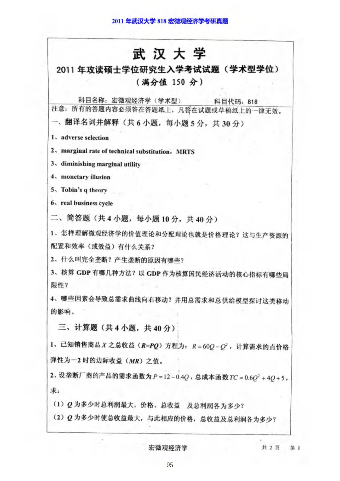武汉大学819宏微观经济学2011年真题