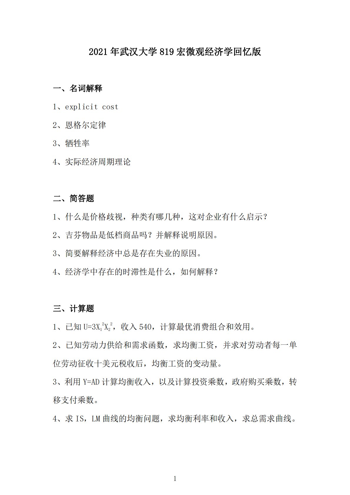 2021年武汉大学819宏微观经济学回忆版一、名词解释1、explicitcost2、恩格尔定律3、牺牲率4、实际经济周期理论二、简答题1、什么是价格歧视,种类有哪几种,这对企业有什么启示?2、吉芬物品是低档商品吗?并解释说明原因。3、简要解释经济中总是存在失业的原因。4、经济学中存在的时滞性是什么,如何解释?三、计算题1、已知U=3X12X22,收入540,计算最优消费组合和效用。2、已知劳动力供给和需求函数,求均衡工资,并求对劳动者每一单位劳动征收十美元税收后,均衡工资的变动量。3、利用Y=AD计算均衡收入,以及计算投资乘数,政府购买乘数,转移支付乘数。4、求IS,LM曲线的均衡问题,求均...
