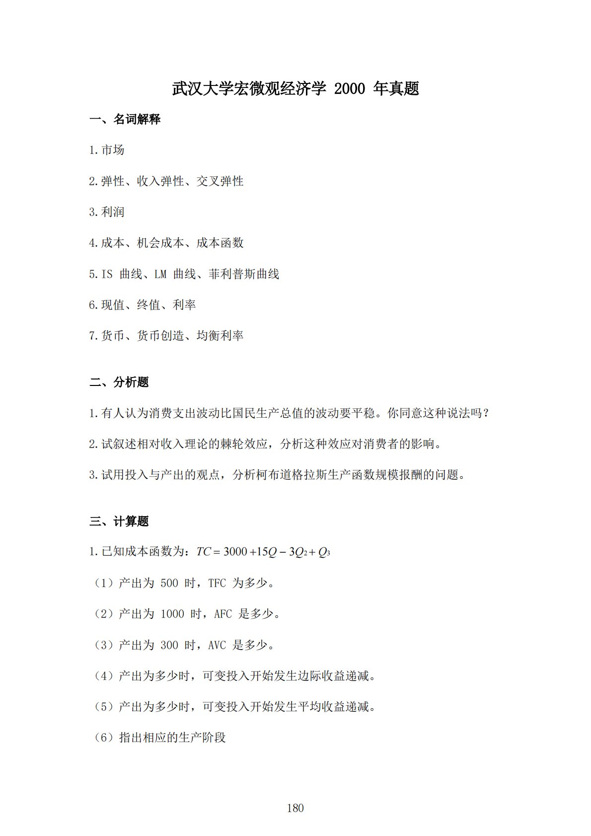 武汉大学宏微观经济学2000年真题一、名词解释1.市场2.弹性、收入弹性、交叉弹性3.利润4.成本、机会成本、成本函数5.IS曲线、LM曲线、菲利普斯曲线6.现值、终值、利率7.货币、货币创造、均衡利率二、分析题1.有人认为消费支出波动比国民生产总值的波动要平稳。你同意这种说法吗?2.试叙述相对收入理论的棘轮效应,分析这种效应对消费者的影响。3.试用投入与产出的观点,分析柯布道格拉斯生产函数规模报酬的问题。三、计算题1.已知成本函数为:TC300015Q3Q2Q3(1)产出为500时,TFC为多少。(2)产出为1000时,AFC是多少。(3)产出为300时,AVC是多少。(4)产...