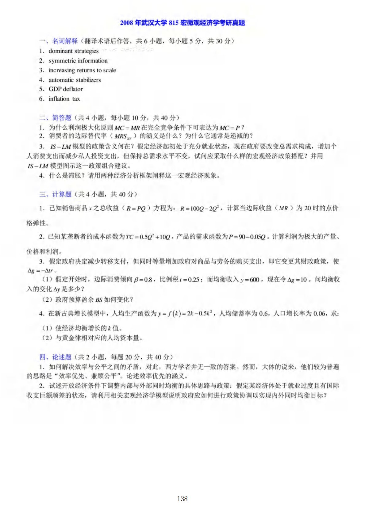 武汉大学819宏微观经济学2008年真题