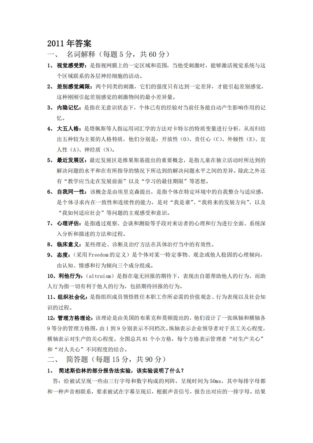 2011年´ð°¸一、名词解释(每题5分,共60分)1、视觉感受野:是指视网膜上的一定区域和范围,当他受刺激时,能够激活视觉系统与这个区域联系的各层神经细胞的活动。2、差别感觉阈限:两个同类的刺激,它们的强度只有达到一定差异,才能引起差别感觉,这种刚刚引起差别感觉的刺激物间的最小差异量。3、内隐记忆:是指在无意识状态下,个体已有的经验对当前任务能自动产生影响作用的记忆。4、大五人格:是塔佩斯等人指运用词汇学的方法对卡特尔的特质变量进行分析,从而归结出五种较为主要的人格特质,他们分别是:开放性(O)、责任心(C)、外倾性(E)、宜人性(A)、神经质(N)。5、最近发展区:最近发展区是维果斯基提出...
