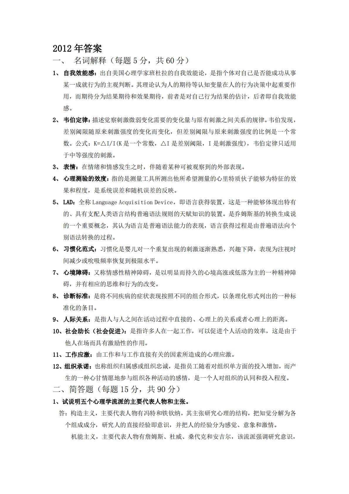 2012年´ð°¸一、名词解释(每题5分,共60分)1、自我效能感:出自美国心理学家班杜拉的自我效能论,是指个体对自己是否能成功从事某一成就行为的主观判断。其理论认为人的期待等认知变量在人的行为决策中起重要作用,而期待分为结果期待和效果期待,前者是对自己行为结果的估计,后者即自我效能感。2、韦伯定律:描述觉察刺激微弱变化需要的变化量与原有刺激之间关系的规律。韦伯发现,差别阈限随原来刺激强度的变化而变化,但差别阈限与原来刺激强度的比例是一个常数。公式:K=△I/I(K是一个常数,△I是差别阈限,I是刺激强度),韦伯定律只适用于中等强度的刺激。3、表情:在情绪和情感发生之时,伴随着某种可被观察到的...