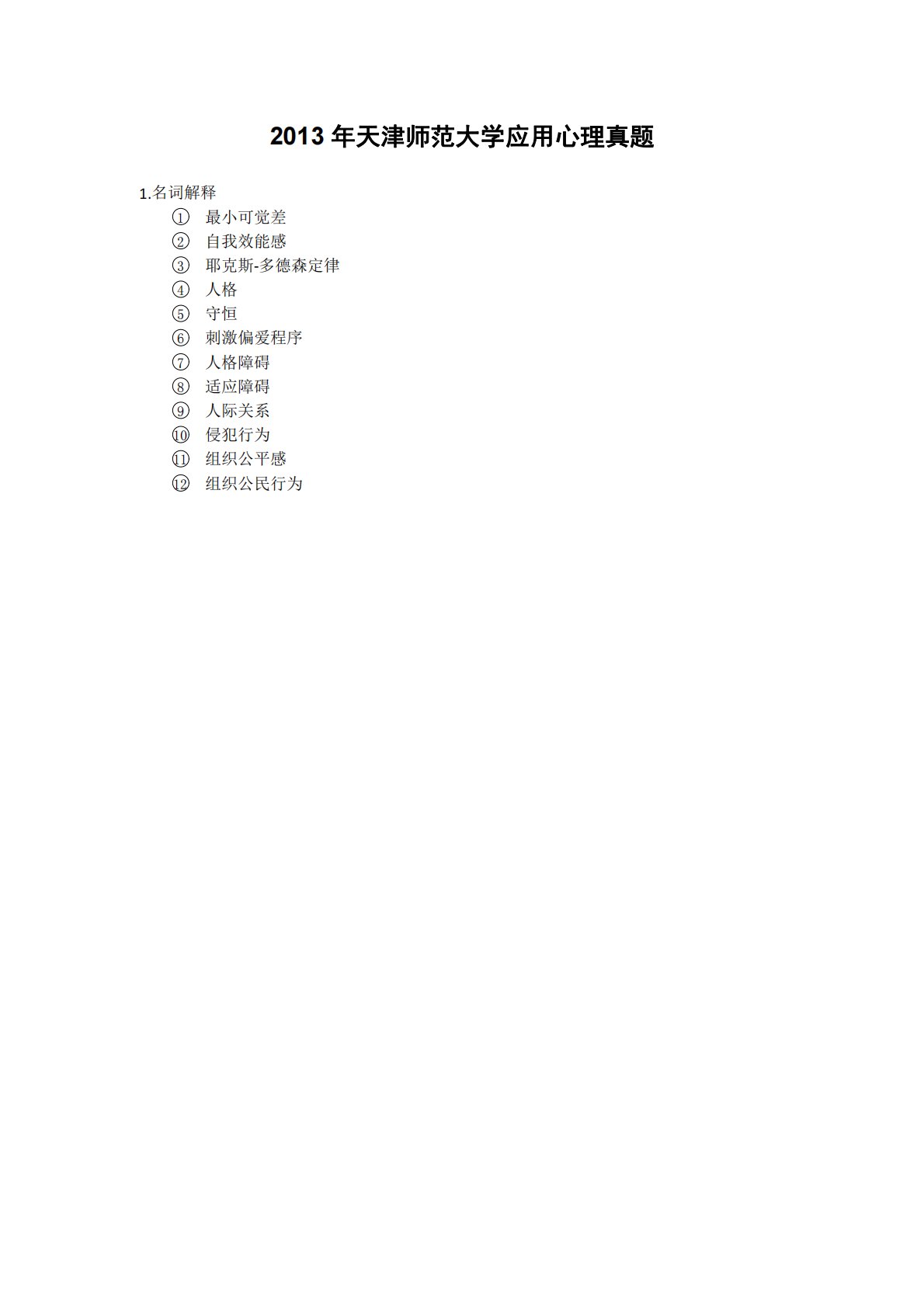 2013年天津师范大学应用心理真题1.名词解释1最小可觉差2自我效能感3耶克斯-多德森定律4人格5守恒6刺激偏爱程序7人格障碍8适应障碍9人际关系10侵犯行为11组织公平感12组织公民行为2013年天津师范大学应用心理真题1.名词解释1最小可觉差2自我效能感3耶克斯-多德森定律4人格5守恒6刺激偏爱程序7人格障碍8适应障碍9人际关系10侵犯行为11组织公平感12组织公民行为2.简答1什么是正负强化和正负惩罚?试举例说明2根据脑电波的变化,睡眠分为几个阶段,各个阶段的特点是?3简要说明连续发展观和阶段发展观的差异4精神病的主要特点有哪些5导致偏见产生的常见原因及结果有哪些?如何消除偏见6什么是群...