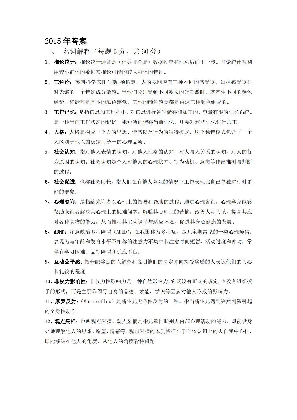 2015年´ð°¸一、名词解释(每题5分,共60分)1、推论统计:推论统计通常是(但并非总是)数据收集和汇总后的下一步。推论统计常利用较小群体的数据来推论可能的较大群体的特征。2、三色论:英国科学家托马斯.杨假定,人的视网膜有三种不同的感受器,每种感受器只对光谱的一个特殊成分敏感。当他们分别受到不同波长的光刺激时,就产生不同的颜色经验。红绿蓝是基本的颜色感觉,其他的颜色感觉都是由这三种颜色组成的。3、工作记忆:是指信息加工过程中,对信息进行暂时储存和加工的、容量有限的记忆系统。是一种当前工作状态的记忆,她短暂的储存当前记忆,还要对这些记忆进行加工。4、人格:人格是构成一个人的思想、情感以及行为...