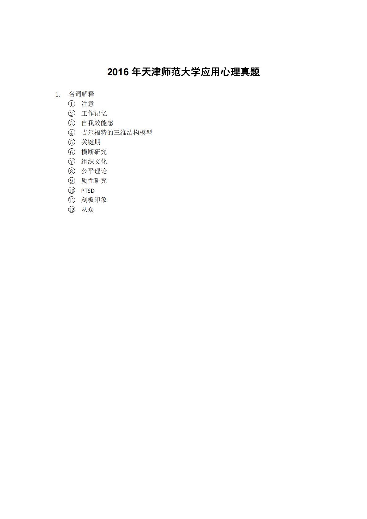 2016年天津师范大学应用心理真题1.名词解释1注意2工作记忆3自我效能感4吉尔福特的三维结构模型5关键期6横断研究7组织文化8公平理论9质性研究10PTSD11刻板印象12从众2016年天津师范大学应用心理真题1.名词解释1注意2工作记忆3自我效能感4吉尔福特的三维结构模型5关键期6横断研究7组织文化8公平理论9质性研究10PTSD11刻板印象12从众2.简答1知觉的组织原则2坎农-巴德学说对詹姆斯-兰格理论提出的三点疑问是什么3发展心理学的研究原则4简要说明领导情景理论的内涵5请列出几条临床与咨询心理学工作伦理的原则6如何用优势反应学说解释社会促进和社会抑制现象3.论述1什么是概念?简述概...