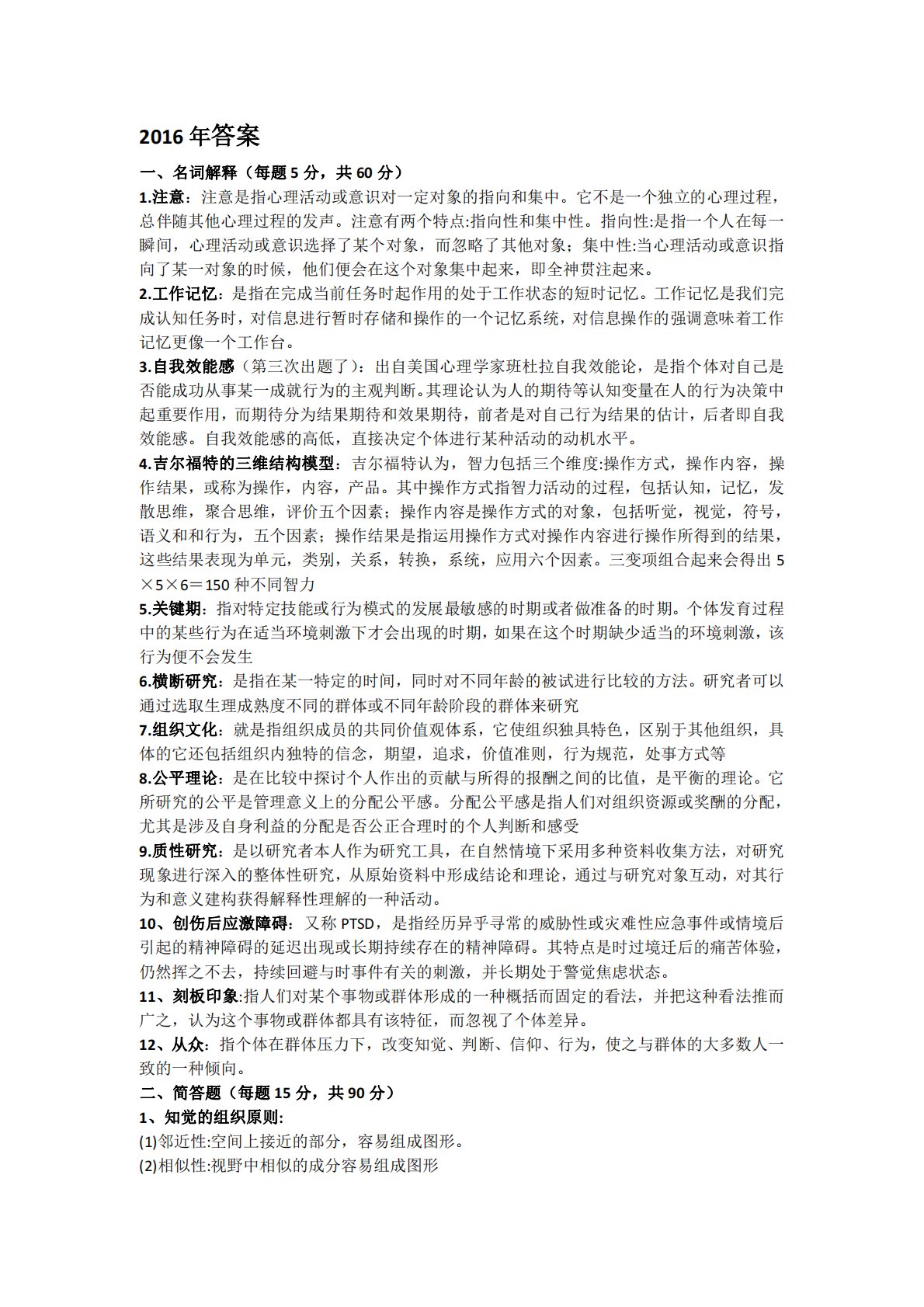 一、名词解释(每题5分,共60分)1.注意:注意是指心理活动或意识对一定对象的指向和集中。它不是一个独立的心理过程,总伴随其他心理过程的发声。注意有两个特点:指向性和集中性。指向性:是指一个人在每一瞬间,心理活动或意识选择了某个对象,而忽略了其他对象;集中性:当心理活动或意识指向了某一对象的时候,他们便会在这个对象集中起来,即全神贯注起来。2.工作记忆:是指在完成当前任务时起作用的处于工作状态的短时记忆。工作记忆是我们完成认知任务时,对信息进行暂时存储和操作的一个记忆系统,对信息操作的强调意味着工作记忆更像一个工作台。3.自我效能感(第三次出题了):出自美国心理学家班杜拉自我效能论,是指个体对...