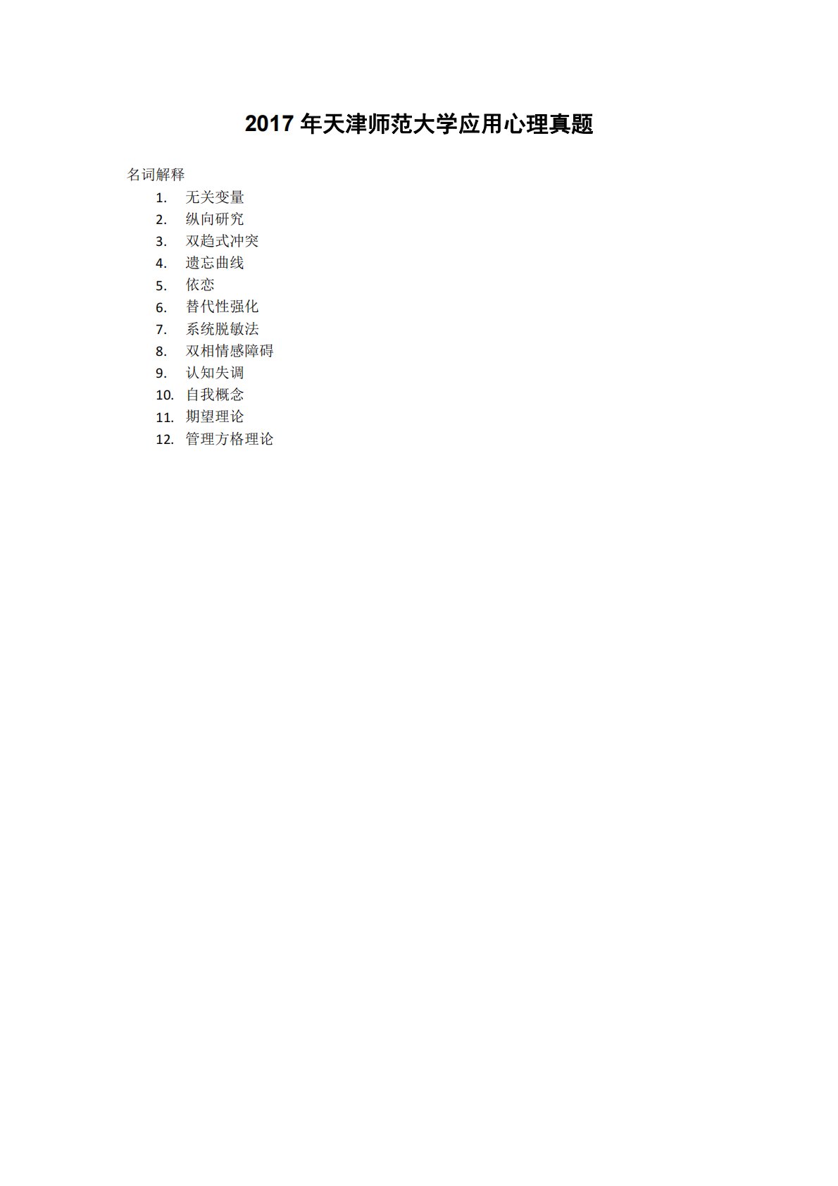 2017年天津师范大学应用心理真题名词解释1.无关变量2.纵向研究3.双趋式冲突4.遗忘曲线5.依恋6.替代性强化7.系统脱敏法8.双相情感障碍9.认知失调10.自我概念11.期望理论12.管理方格理论2017年天津师范大学应用心理真题名词解释1.无关变量2.纵向研究3.双趋式冲突4.遗忘曲线5.依恋6.替代性强化7.系统脱敏法8.双相情感障碍9.认知失调10.自我概念11.期望理论12.管理方格理论简答1.简要说明影响知觉选择性的因素2.简要说明心理测验标准化的主要内容3.简要说明小学儿童思维发展的基本特点4.简要说明人格障碍的一般临床特征5.简要说明人际关系的三维理论6.简要说明领导影响力...