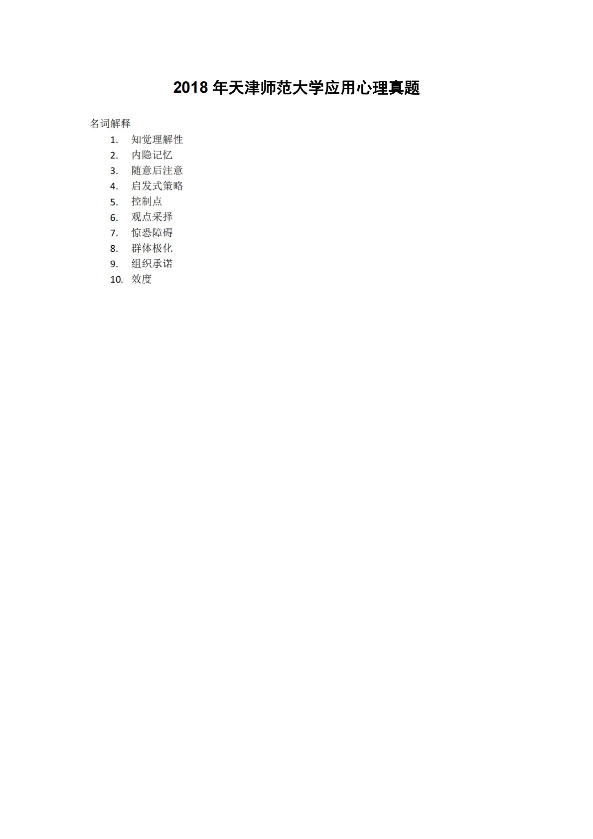 2018年天津师范大学应用心理真题名词解释1.知觉理解性2.内隐记忆3.随意后注意4.启发式策略5.控制点6.观点采择7.惊恐障碍8.群体极化9.组织承诺10.效度2018年天津师范大学应用心理真题名词解释1.知觉理解性2.内隐记忆3.随意后注意4.启发式策略5.控制点6.观点采择7.惊恐障碍8.群体极化9.组织承诺10.效度简答1.简要说明心理测验标准化应具备的条件2.简要说明动机和行为效率的关系3.简要说明艾森克提出的人格维度及生物学基础4.简要说明认知老化的加工资源理论5.简要说明心理正常与异常的界定标准6.简要说明冲突的主要特征及基本过程论述1.试分析惩罚与负强化的联系和区别2.述评情...