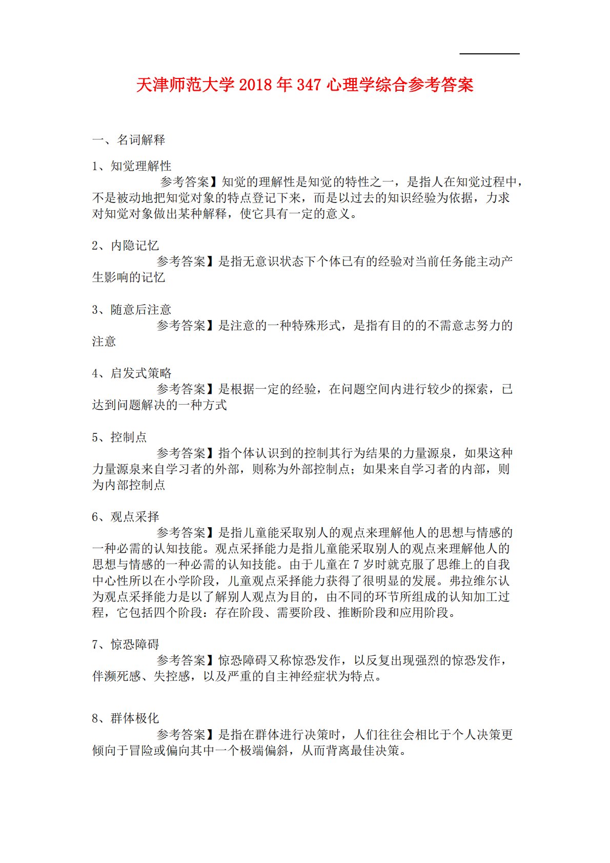 天津师范大学2018年347心理学综合参考答案一、名词解释1、知觉理解性参考答案】知觉的理解性是知觉的特性之一,是指人在知觉过程中,不是被动地把知觉对象的特点登记下来,而是以过去的知识经验为依据,力求对知觉对象做出某种解释,使它具有一定的意义。2、内隐记忆参考答案】是指无意识状态下个体已有的经验对当前任务能主动产生影响的记忆3、随意后注意参考答案】是注意的一种特殊形式,是指有目的的不需意志努力的注意4、启发式策略参考答案】是根据一定的经验,在问题空间内进行较少的探索,已达到问题解决的一种方式5、控制点参考答案】指个体认识到的控制其行为结果的力量源泉,如果这种力量源泉来自学习者的外部,则称为外部...