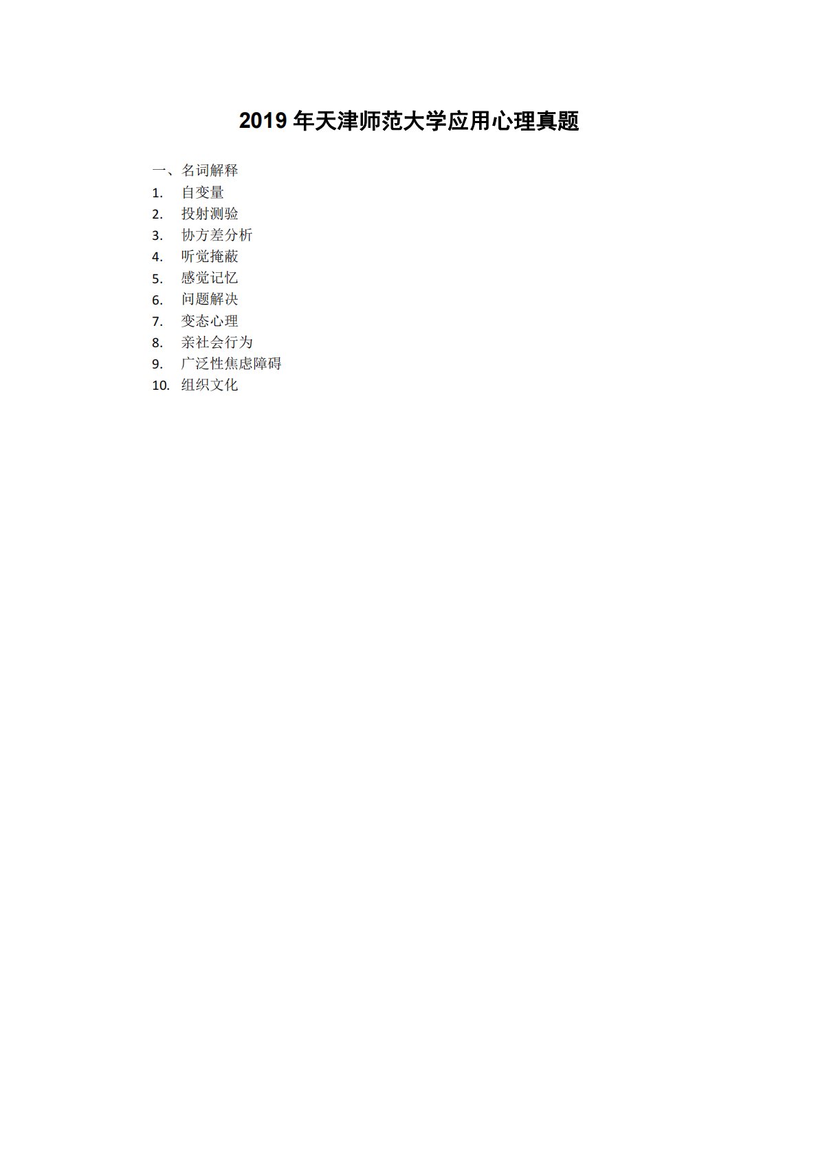 2019年天津师范大学应用心理真题一、名词解释1.自变量2.投射测验3.协方差分析4.听觉掩蔽5.感觉记忆6.问题解决7.变态心理8.亲社会行为9.广泛性焦虑障碍10.组织文化2019年天津师范大学应用心理真题一、名词解释1.自变量2.投射测验3.协方差分析4.听觉掩蔽5.感觉记忆6.问题解决7.变态心理8.亲社会行为9.广泛性焦虑障碍10.组织文化二、简答1.简要说明乔姆斯基的转化生成语法理论2.简要说明人格成分中的自我控制系统3.简要说明认识老化的执行功能减退假说4.简要说明青春期人际关系的心理特点5.简要说明多动症的临床表现6.简要说明领导和管理的联系和区别三、论述1.依据生态系统理论论...