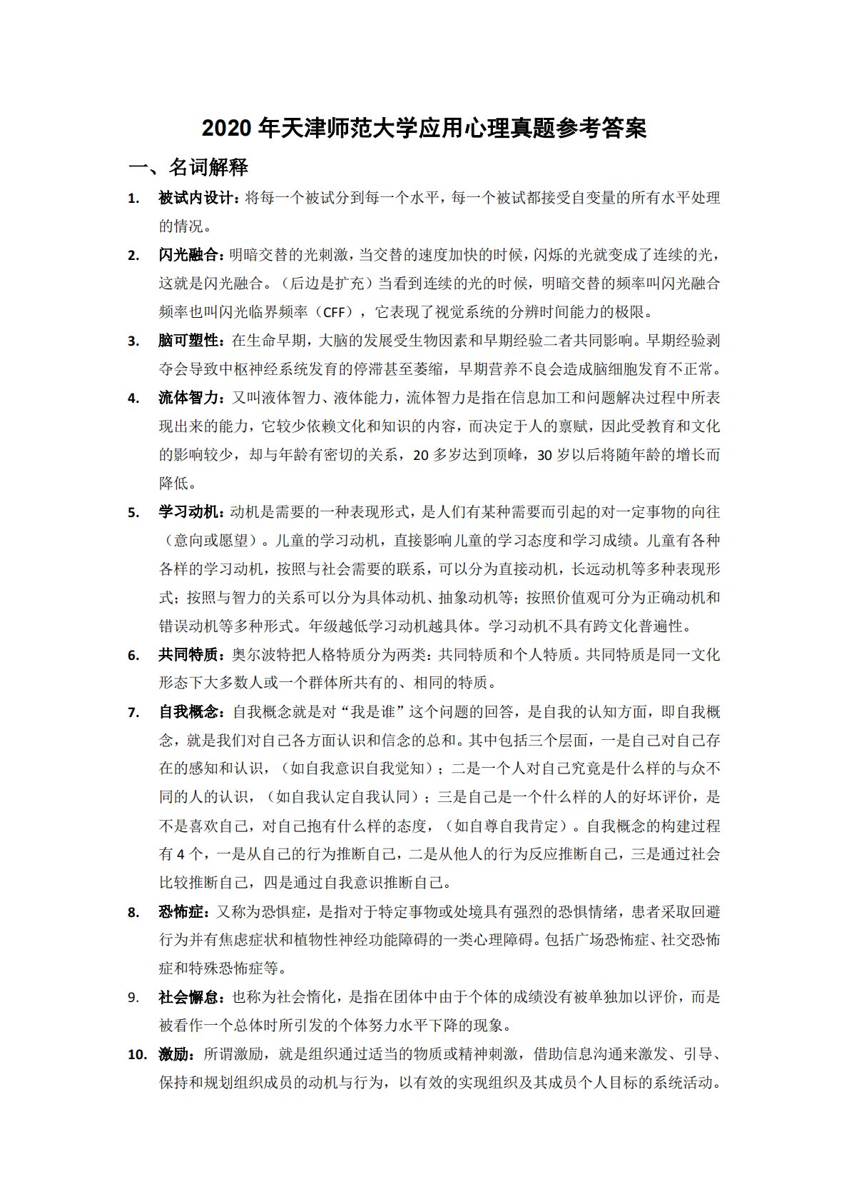 2020年天津师范大学应用心理真题参考答案一、名词解释1.被试内设计:将每一个被试分到每一个水平,每一个被试都接受自变量的所有水平处理的情况。2.闪光融合:明暗交替的光刺激,当交替的速度加快的时候,闪烁的光就变成了连续的光,这就是闪光融合。(后边是扩充)当看到连续的光的时候,明暗交替的频率叫闪光融合频率也叫闪光临界频率(CFF),它表现了视觉系统的分辨时间能力的极限。3.脑可塑性:在生命早期,大脑的发展受生物因素和早期经验二者共同影响。早期经验剥夺会导致中枢神经系统发育的停滞甚至萎缩,早期营养不良会造成脑细胞发育不正常。4.流体智力:又叫液体智力、液体能力,流体智力是指在信息加工和问题解决过程...